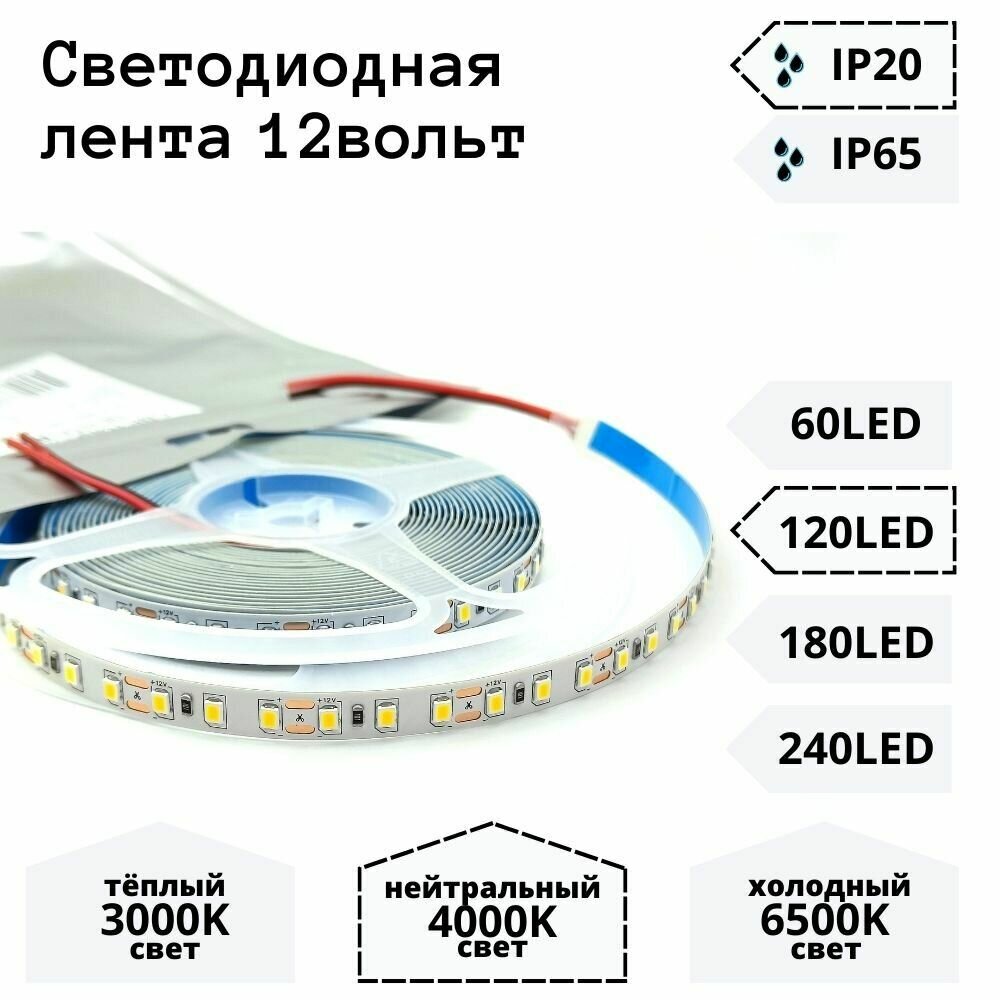 General, Светодиодная лента серия STANDART, Мощность 9,6 Вт/1 м, Цвет свечения - холодный белый 6500К, 12 вольт, Количество светодиодов на метр 120 шт., Степень защиты от пыли и влаги IP20, Длина 5 м