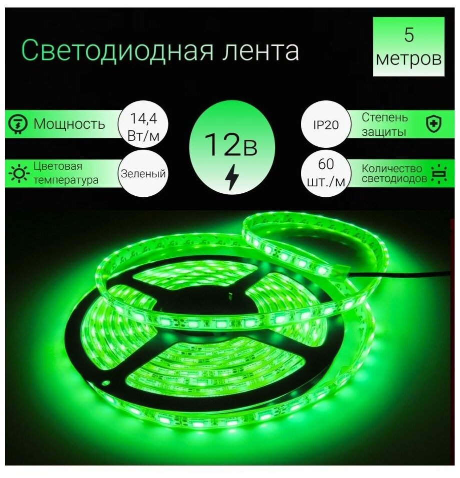 Лента светодиодная GENERAL 14.4 Вт/м 12V IP20 зеленый (5050, 60 диодов/м, 300 диодов/5м) (катушка 5м)
