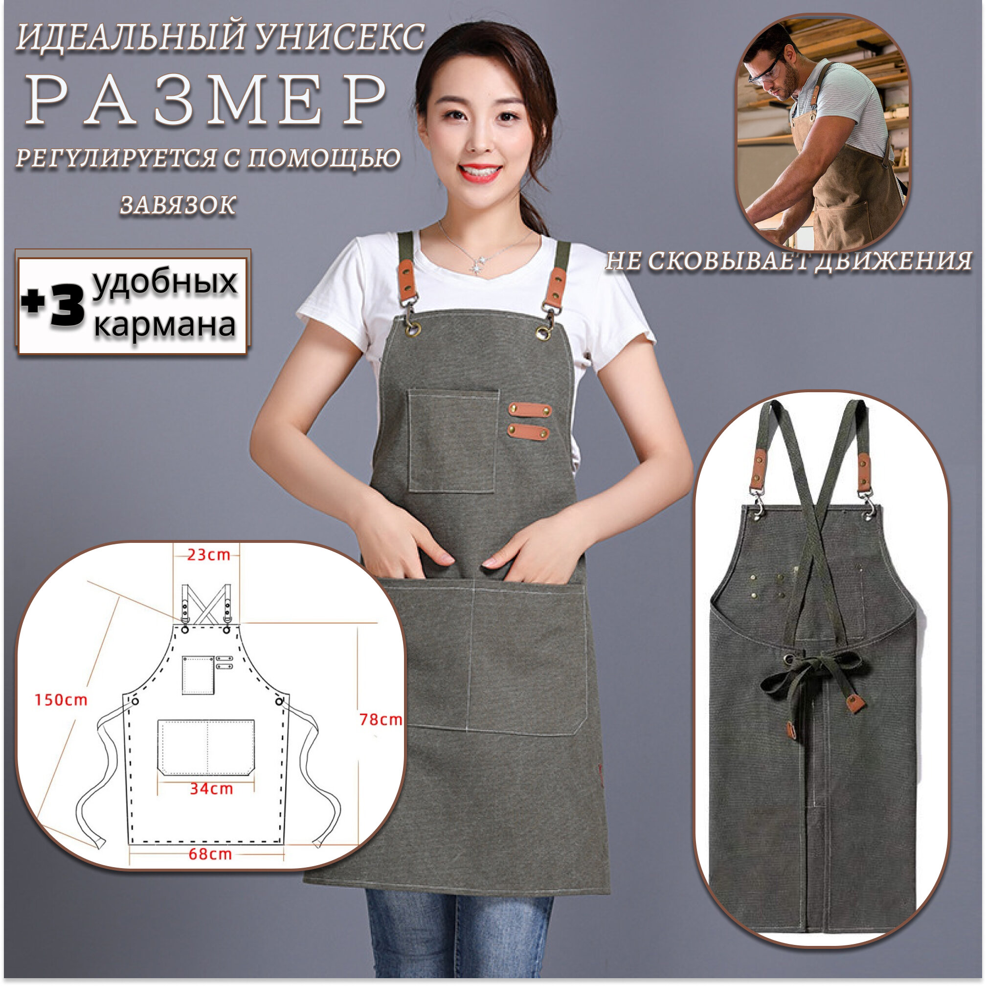 СохранитьФартук универсальный плотный для официанта, бармена, бариста, парикмахера, продавца, повара, кондитера, флориста, кухонный, рабочий. Цвет хаки. интересное: