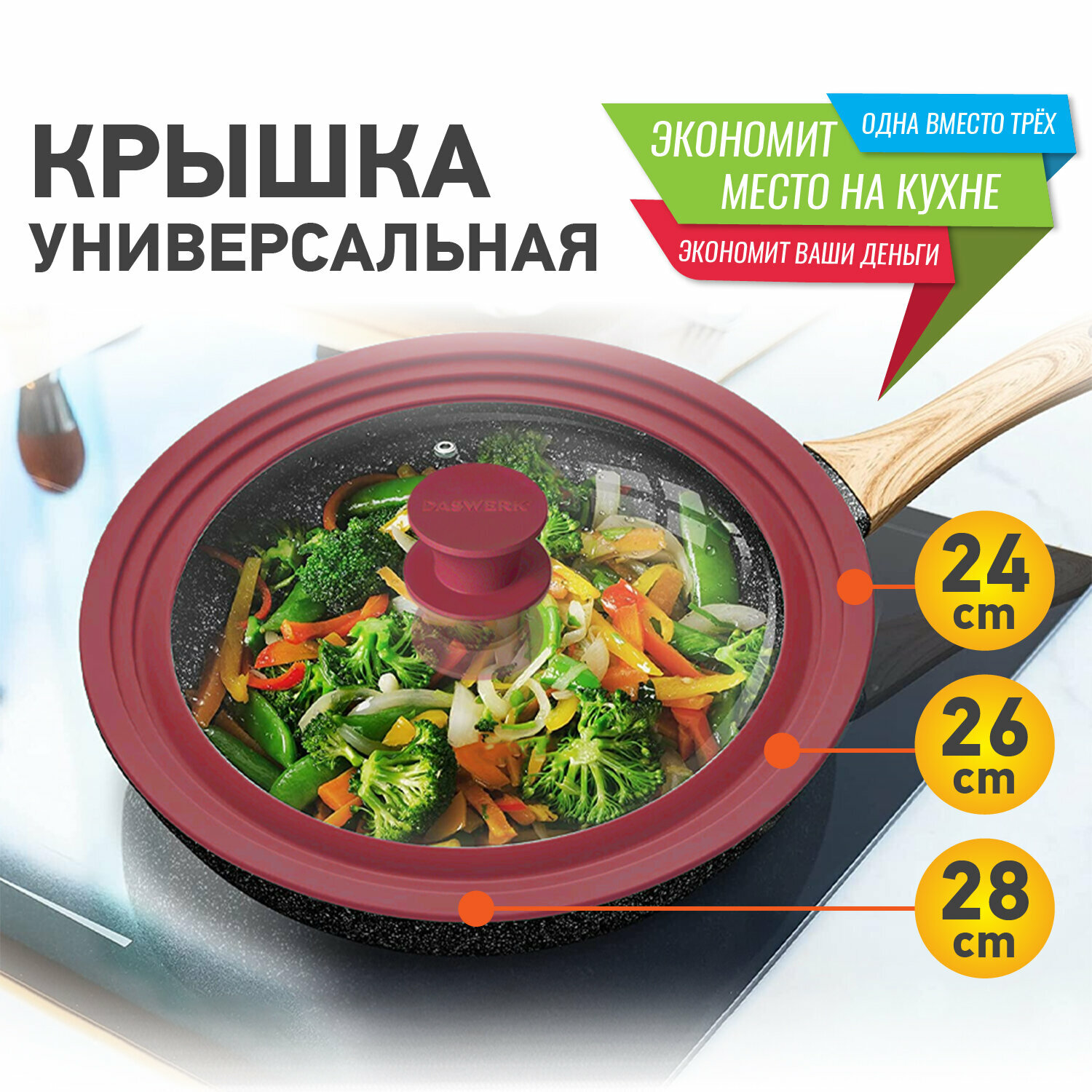 Крышка для любой сковороды и кастрюли универсальная 3 размера (24-26-28 см) бордовая, Daswerk, 60759 .