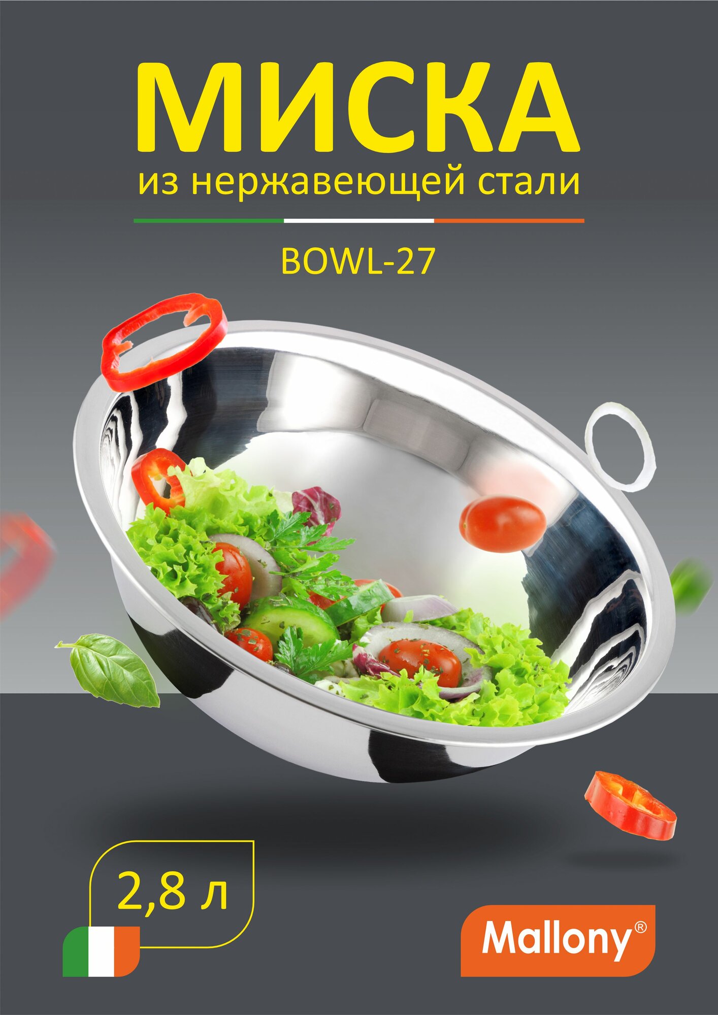 Mallony Миска Bowl-25 объем 2,3 л с расшир краями из нерж стали зеркальная полировка диа 25 см 003275