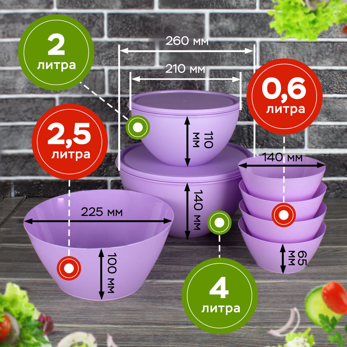 | Комплектация | миски с крышкой 4л-1шт; 2л-1шт; салатники без крышек- 2,5л- 1шт; 0,6л- 2шт. |