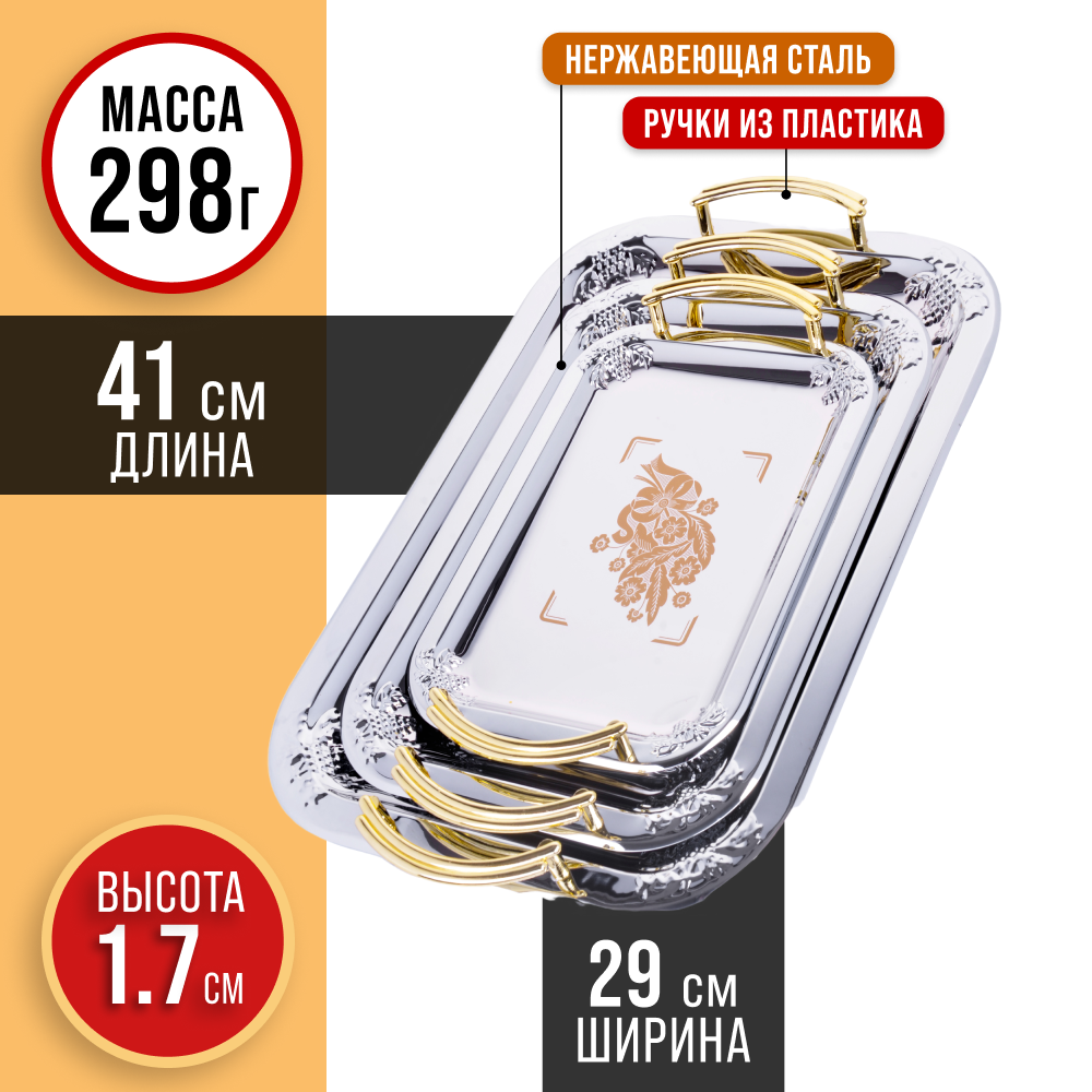 | Дополнительная информация | Набор: 3 подноса разного размера. Поднос большой: 41 х 29 х 1,7 см, дно: 24 х 21 см. Поднос средний: 32,5 х 23,5 х 1,5 см, дно: 26 х 17 см. Поднос малый: 26,5 х 19 см х 1,3 см, дно: 21 х 14 см. |