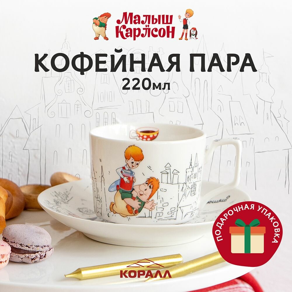 Купить Чайная кофейная пара фарфор 220 мл. в подарочной упаковке "Малыш и Карлсон" ручка квадрат чашка с блюдцем