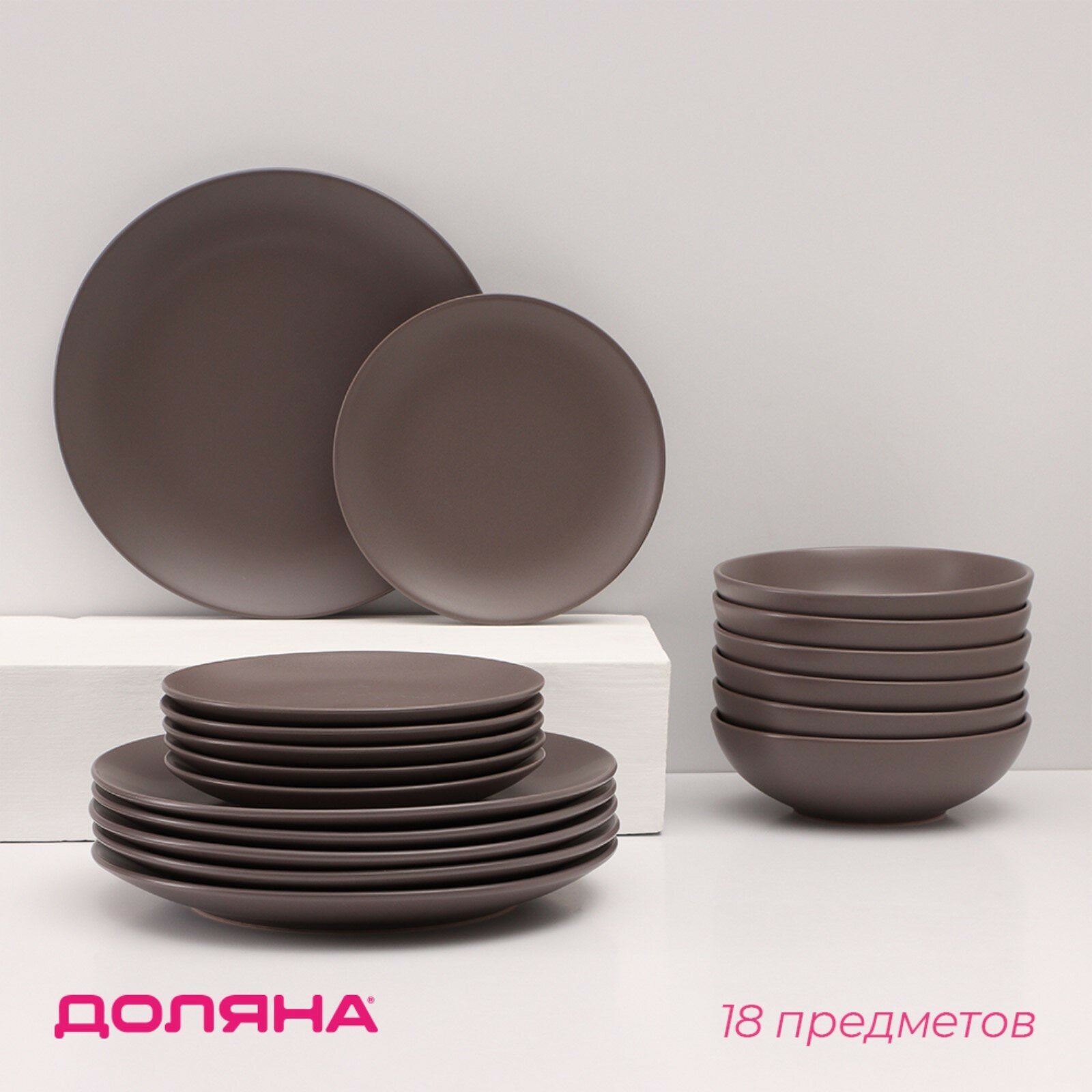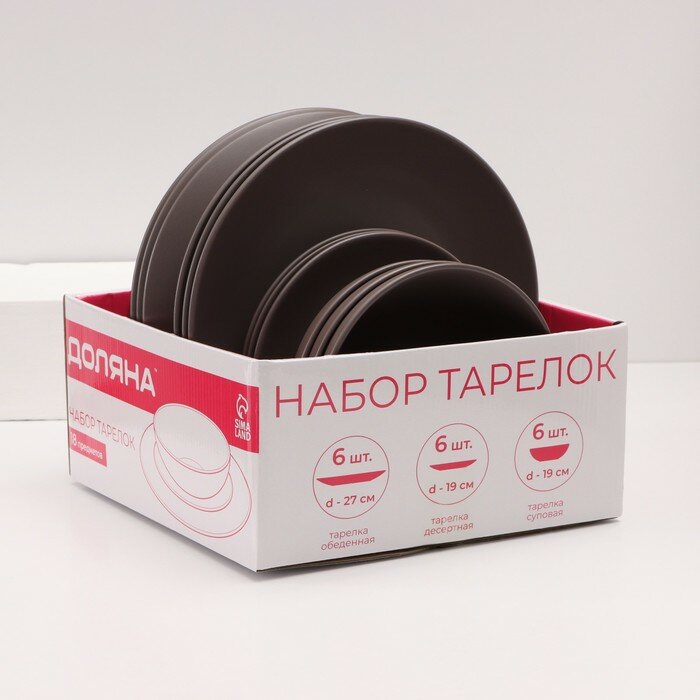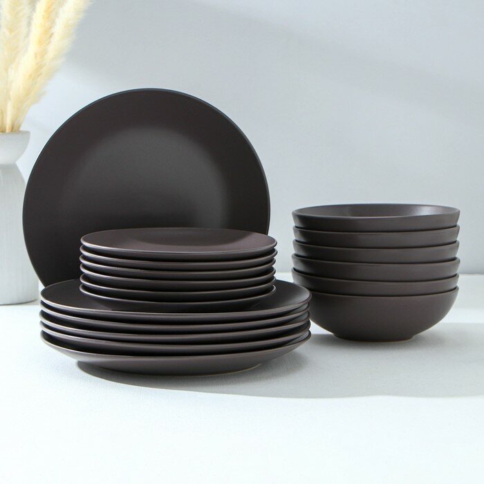 Купить Набор тарелок Доляна «Пастель», 18 предметов: 6 тарелок d=19 см, 6 тарелок d=27 см, 6 мисок d=19 см, цвет коричневый
