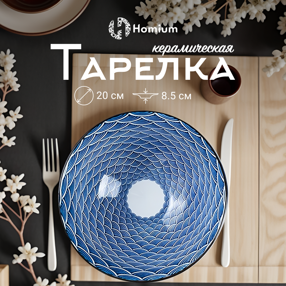 Керамическая тарелка Homium, Japanese Collection в японском стиле, обеденная тарелка с рисунком, голубой, D20см, набор 2шт.