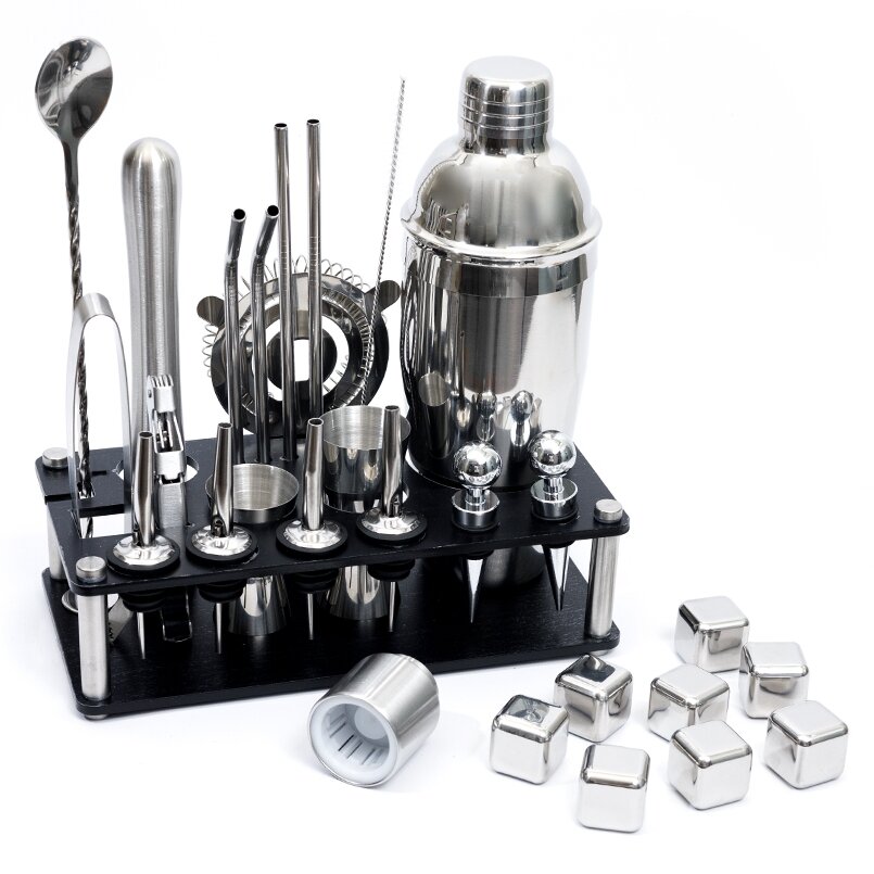 | Подробная комплектация | 1 Европейский шейкер 750 мл, 2 штопор 3 стрейнер 4 длинная ложка с пяткой 5 мадлер 6 щипцы для кубиков и льда 7 джиггер 15/30мл 8 джиггер 25/50мл 9 щетка для трубок 10 гейзеры для равномерного разлива напитков 4шт. 11 охлаждающие кубики 4шт. 12 трубочки прямые 2шт. 13 трубочки изогнутые 2шт. 14 пробки 2шт. 15 подставка 16 рецепты коктейлей (на английском) |