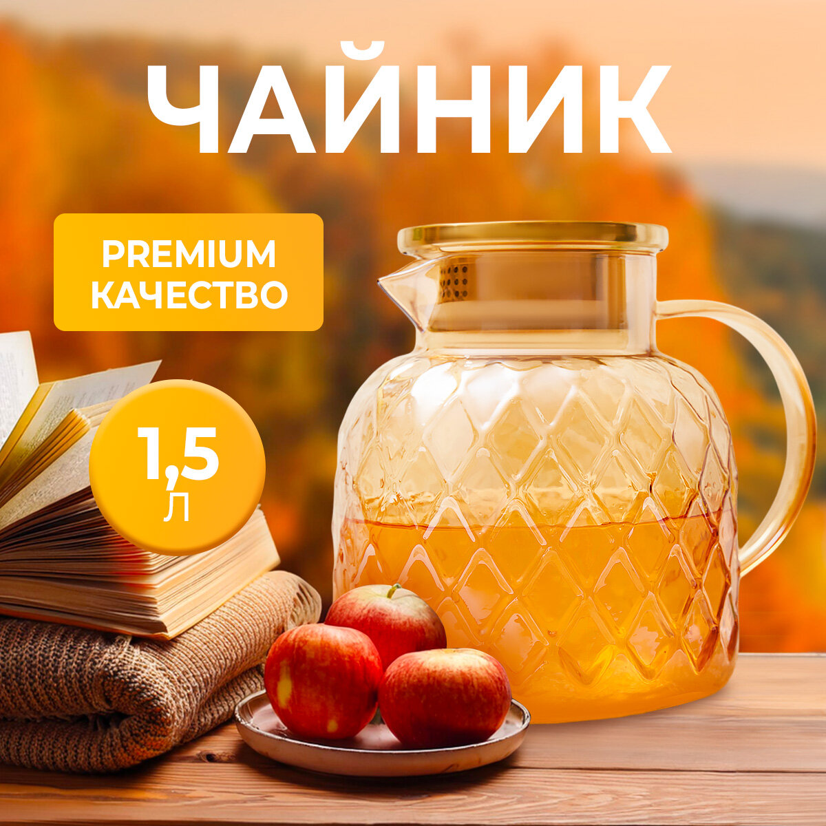 Чайник стеклянный заварочный из жаропрочного стекла, 1.5 л