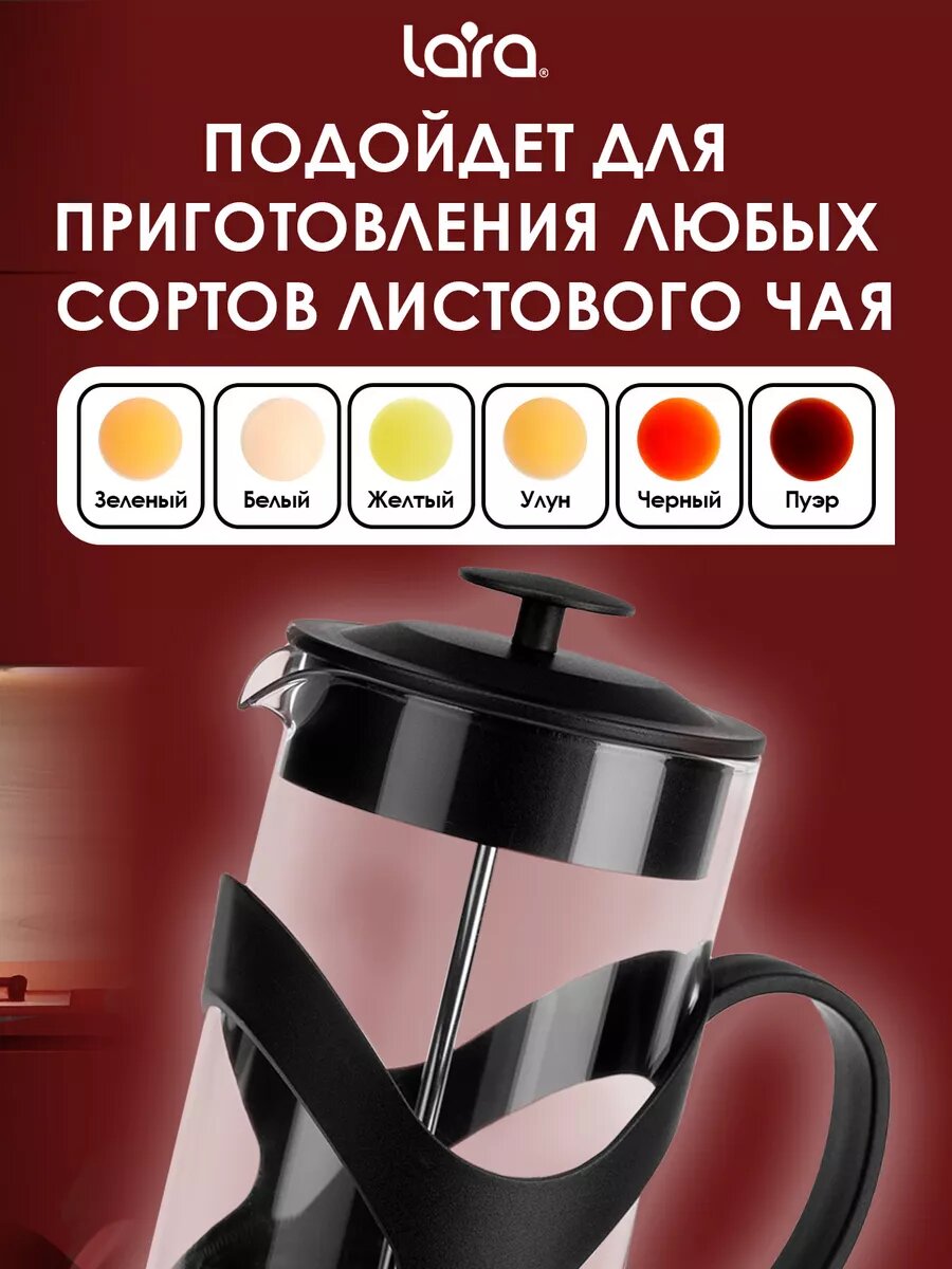 Чайник заварочный стеклянный Lara / Лара LR06-56- 800 френч-пресс, черный 0.8л / заварник / посуда для чая