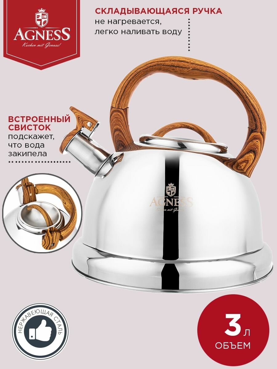 Чайник со свистком Agness 3 л, для всех видов плит, нержавеющая сталь