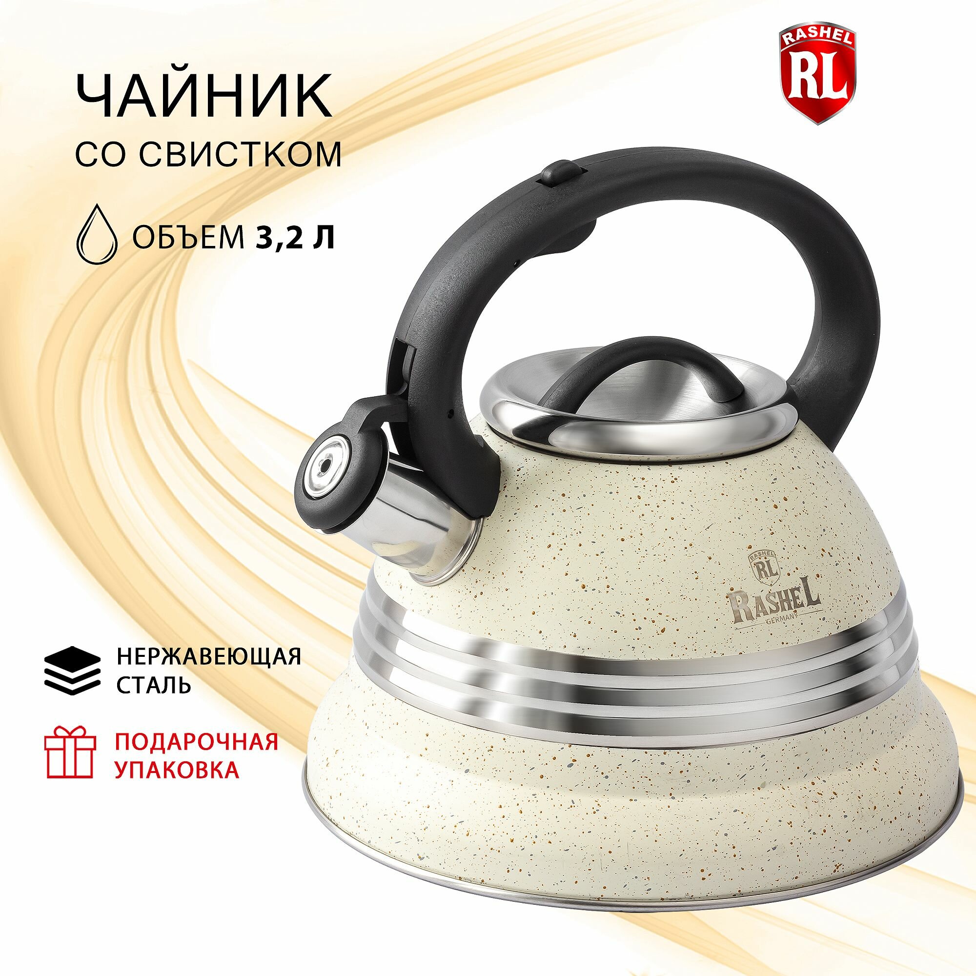 Купить Чайник нержавеющая сталь, 3.2 л, со свистком, зеркальный, RasheL, индукция, кремовый, М-7906