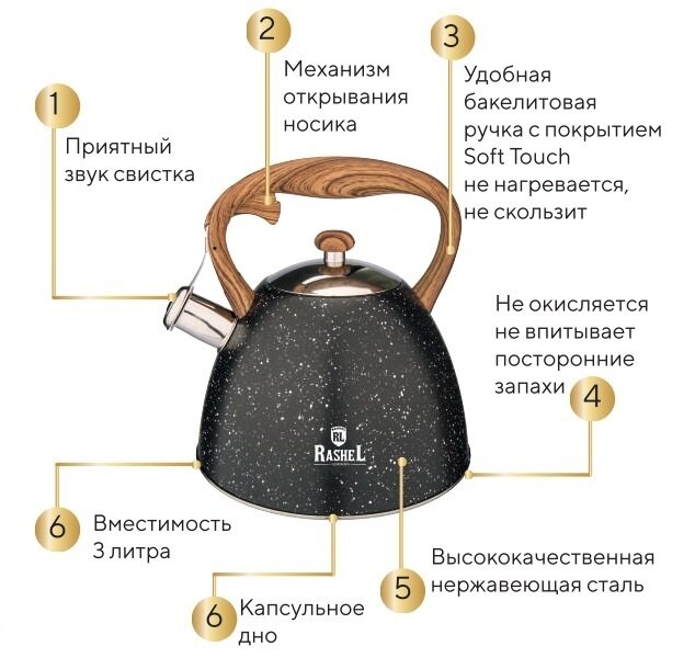 | Особенности | индукционное дно / со свистком / термоизолированная ручка |