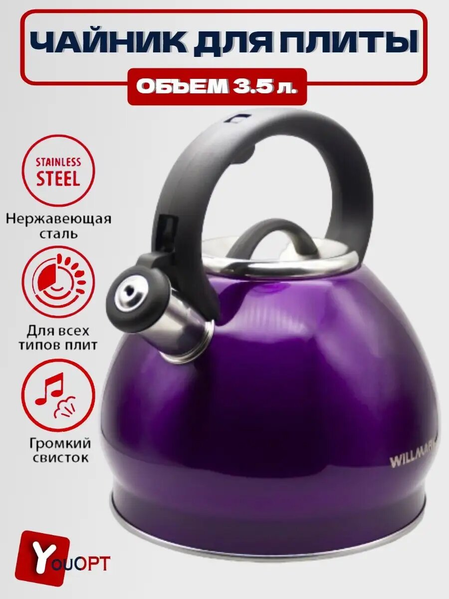 Чайник WILLMARK WTK-4221SS фиолетовый (3,5л, со свистком, с крышкой, нейлоновая ручка,техн. Easy spout open)