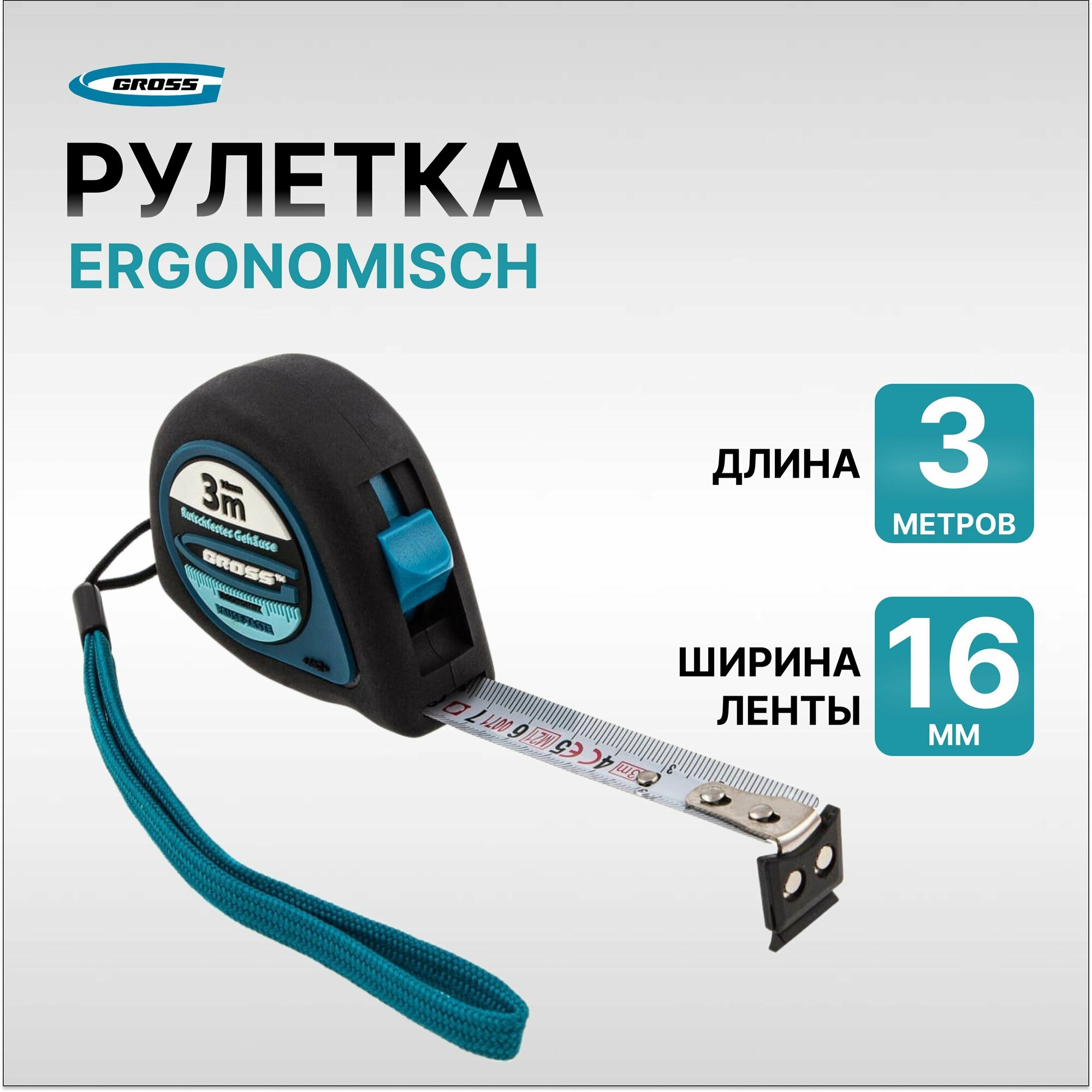 Рулетка Gross 31101, ''Ergonomisch'', 3 м x 16 мм, магнитный обрезиненный зацеп интересное: