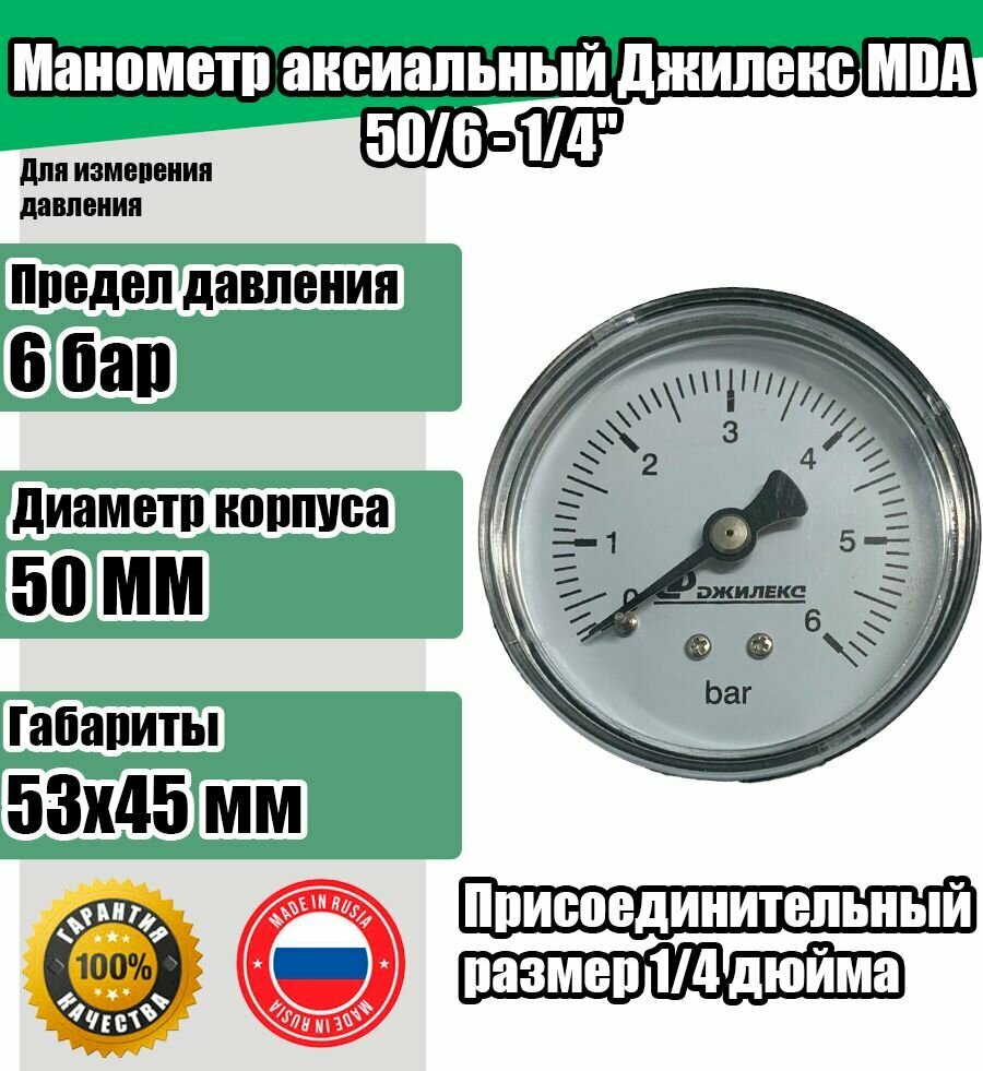 ДЖИЛЕКС Манометр Джилекс МDА 50/6 - 1/4", аксиальный