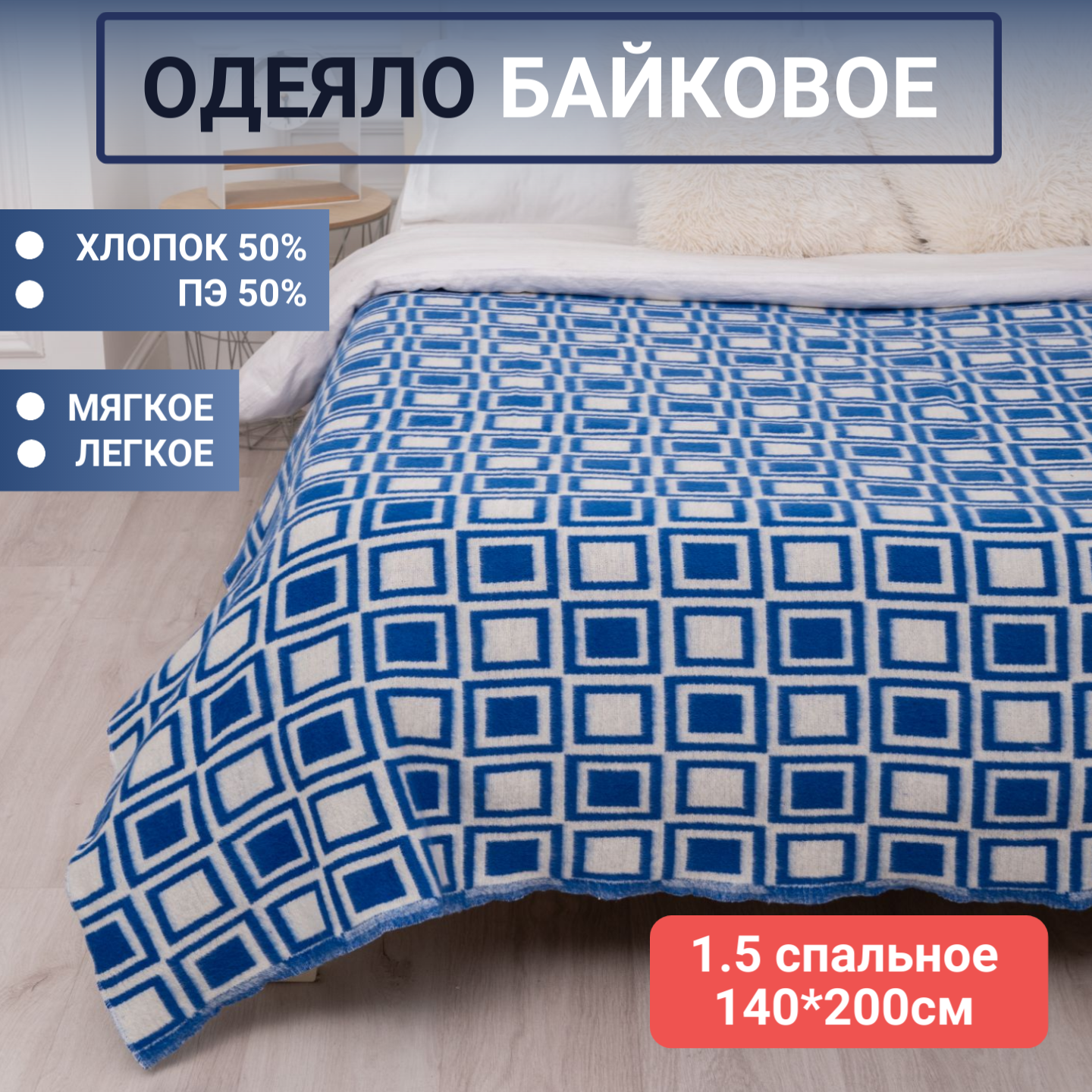 Одеяло байковое 1,5 спальное (140*200см), синее, клетка "ЗефирТекс", мягкое, хлопковое интересное: