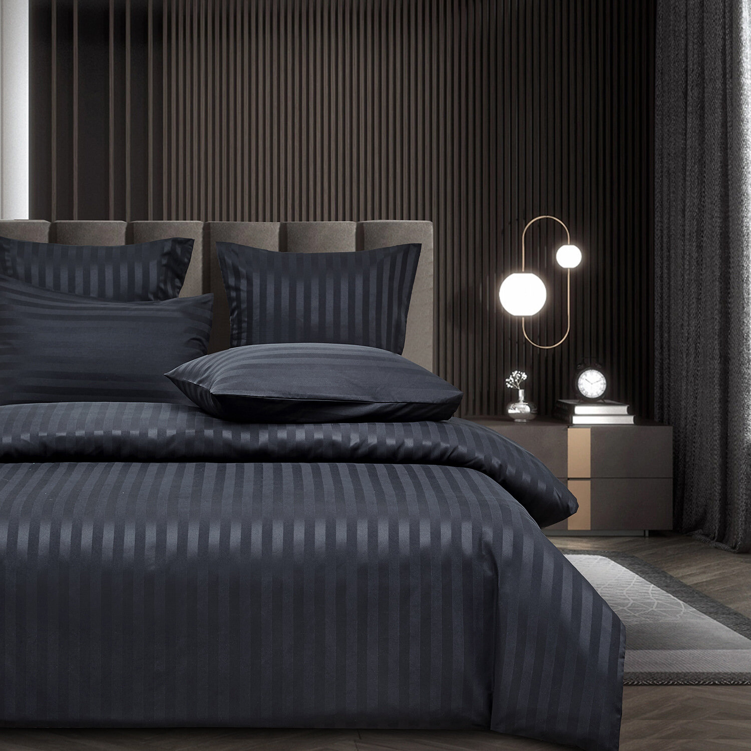 Постельное белье евро двуспальное черный BorisMency страйп сатин простынь 215x230, пододеяльник 200x220, наволочки 50x70-2, 70x70-2