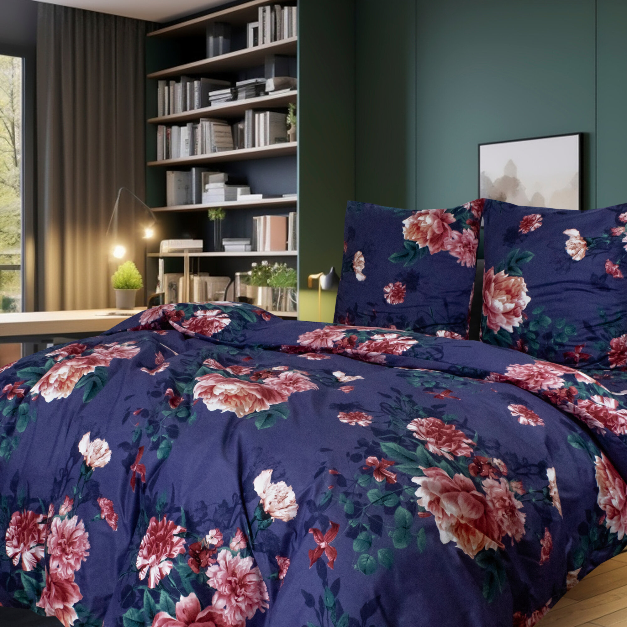 Постельное белье евро с пионами Cleo Art Color, комплект из полисатина, наволочки 50х70 и 70х70