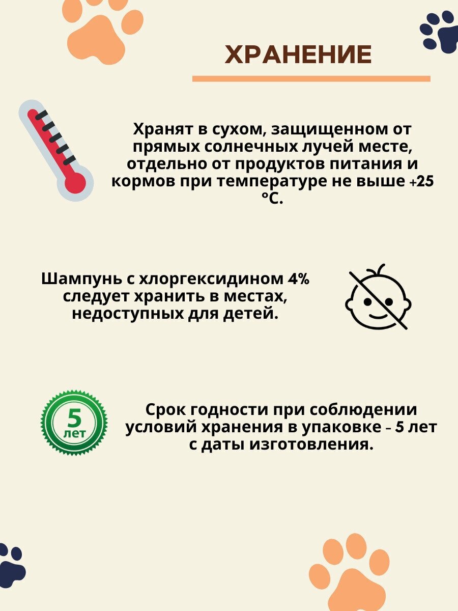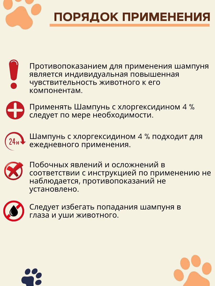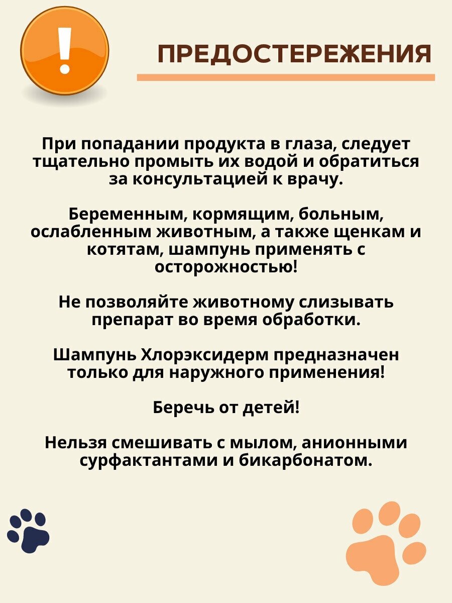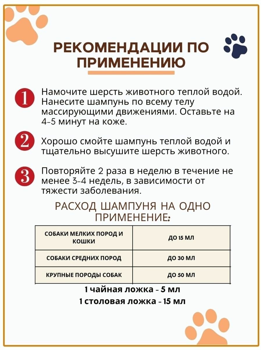 | Способ применения | Намочите шерсть животного теплой водой. Нанесите шампунь по всему . Оставьте на 4-5 минут на коже. Хорошо смойте шампунь теплой водой и тщательно высушите шерсть животного. Повторяйте 2 раза в неделю в течение не менее 3-4 недель, в зависимости от тяжести заболевания. |