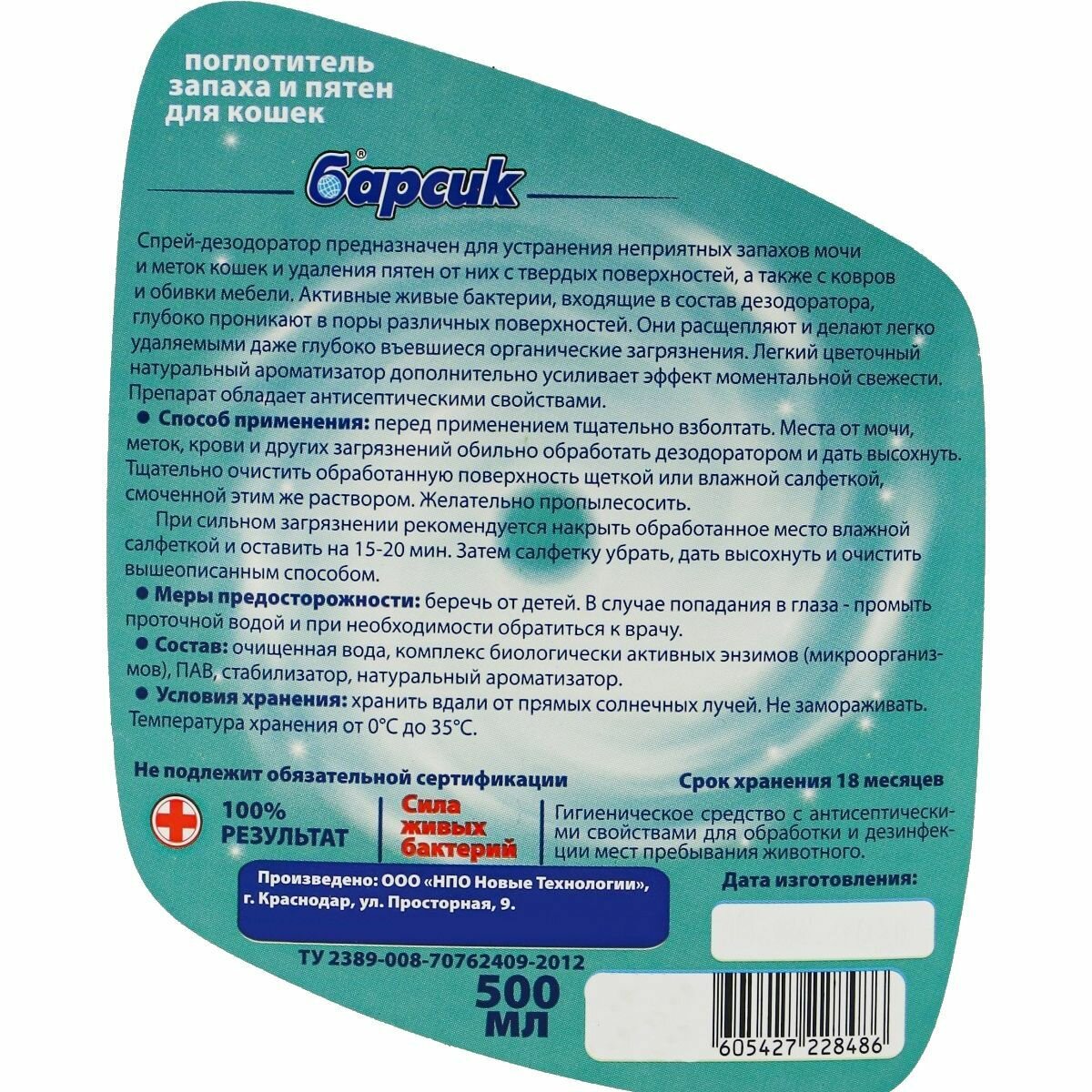 Барсик Поглотитель запаха и пятен для кошек 500мл 92500 0,54 кг 34611 интересное: