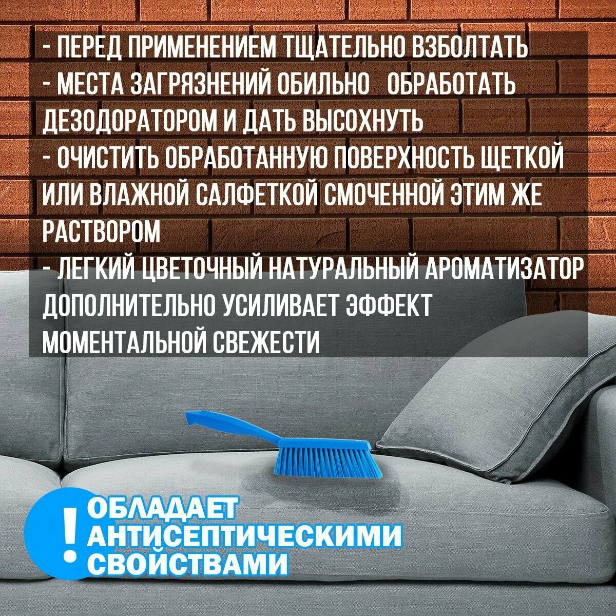 | Способ применения | Перед применением тщательно взболтать. Места от мочи, меток, крови и других загрязнений обильно обработать дезодоратором и дать высохнуть. Тщательно очистить обработанную поверхность щеткой или влажной салфеткой, смоченной этим же раствором, Желательно пропылесосить. При сильном загрязнении рекомендуется накрыть обработанное место влажной сапфеткой и оставить на 15-20 мин. Затем салфетку убрать, дать высохнуть и очистить вышеописанным способом. |