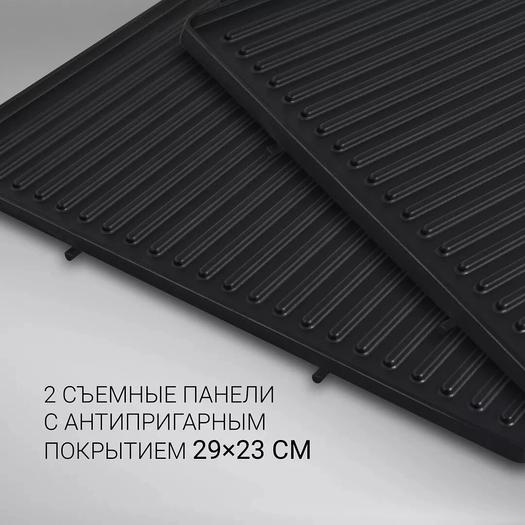 | Особенности | антипригарное покрытие / поддон для сбора жира / регулировка высоты верхней панели / съемные пластины |