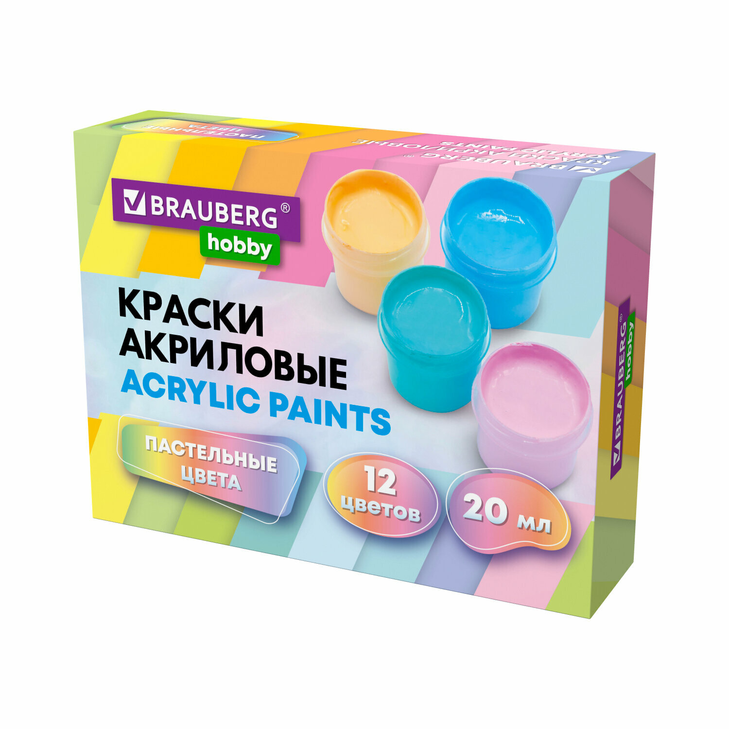Краски акриловые набор Пастельные для рисования и творчества, 12 цветов по 20 мл, Brauberg Hobby, 192440