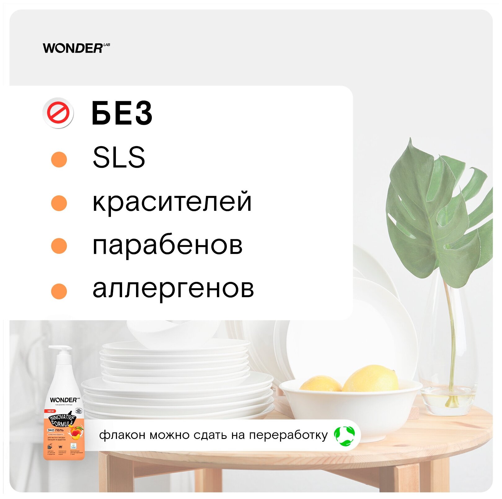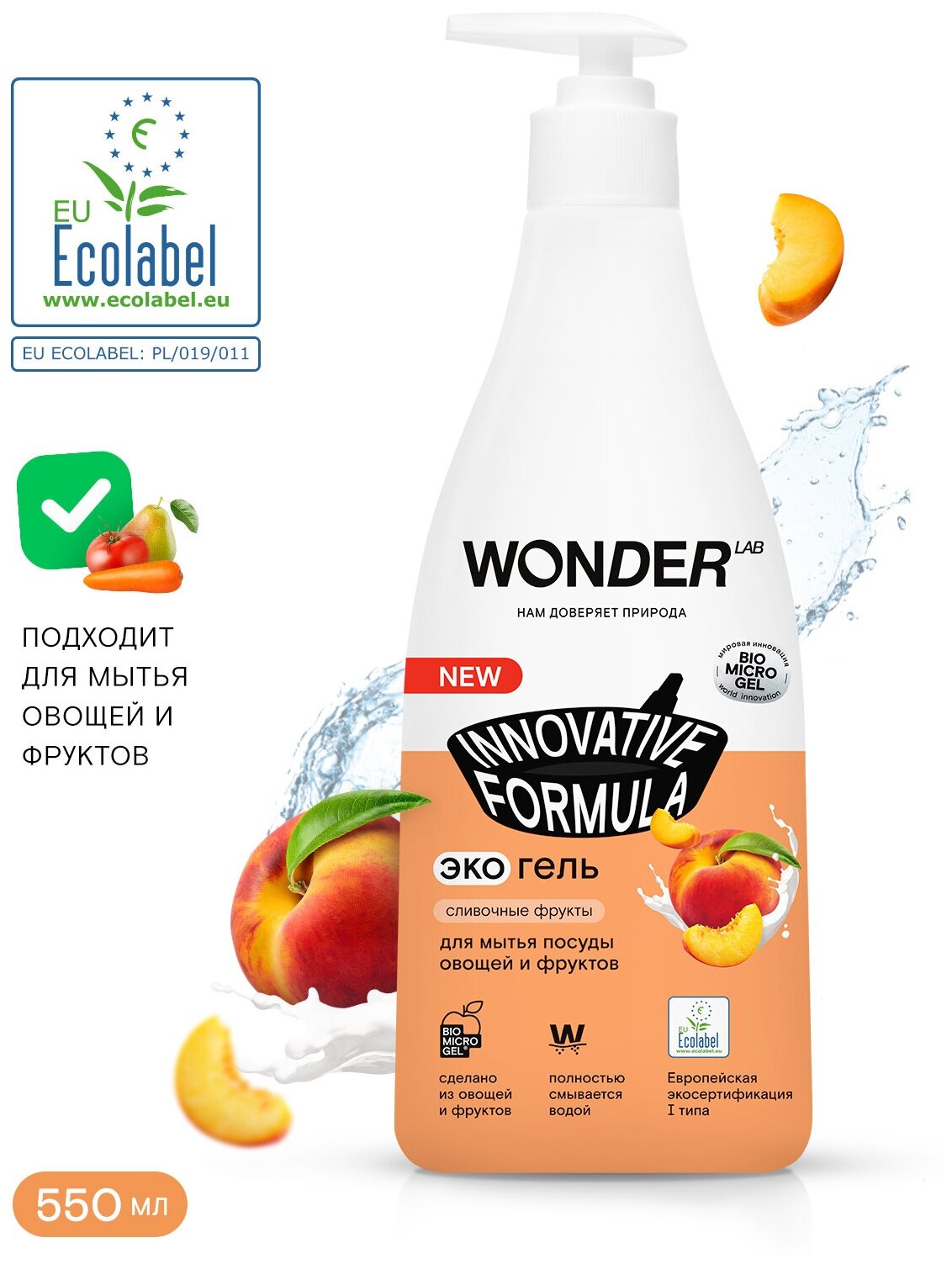 Эко гель для мытья посуды овощей и фруктов с нежным ароматом сливочных фруктов WONDER LAB, 550 мл