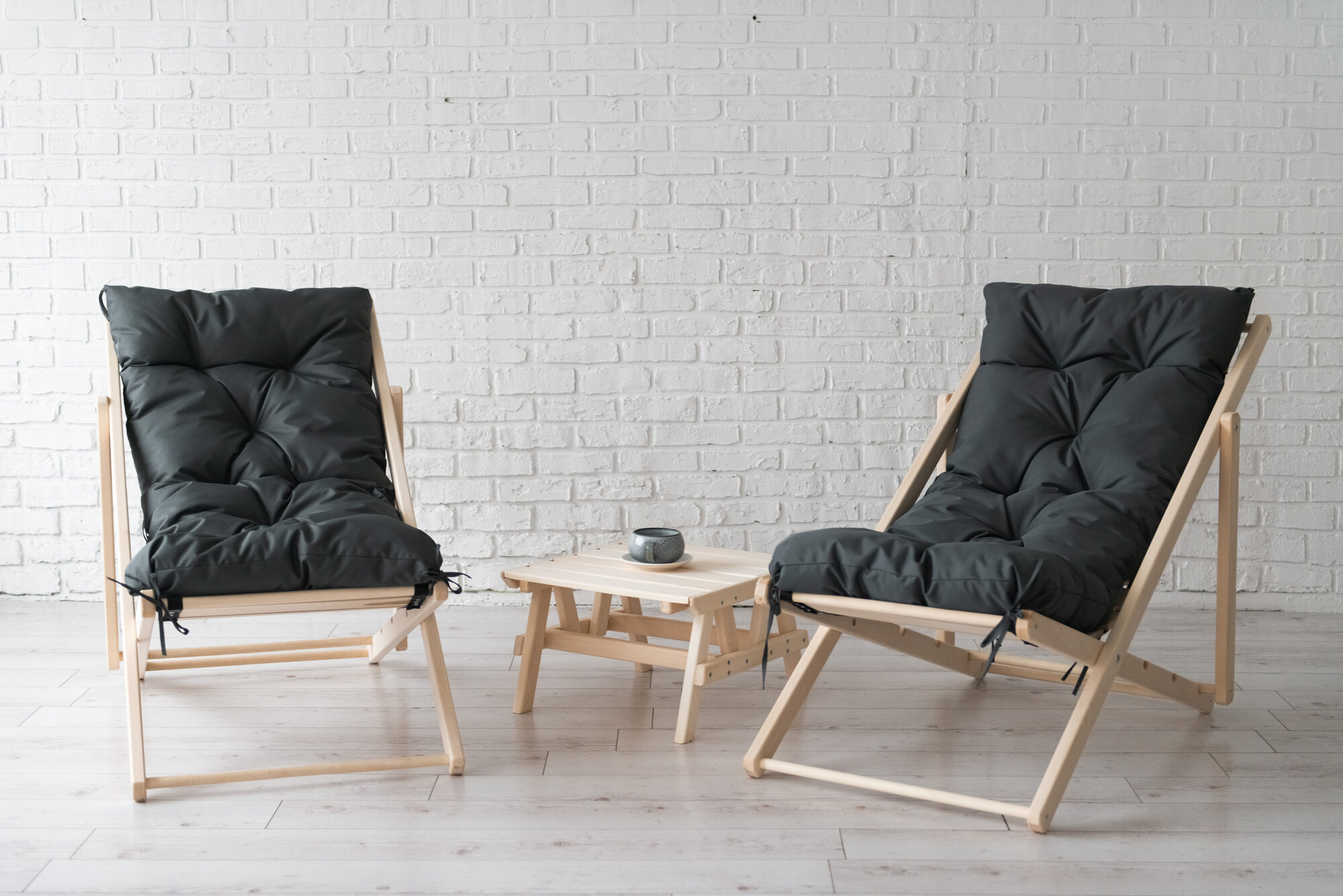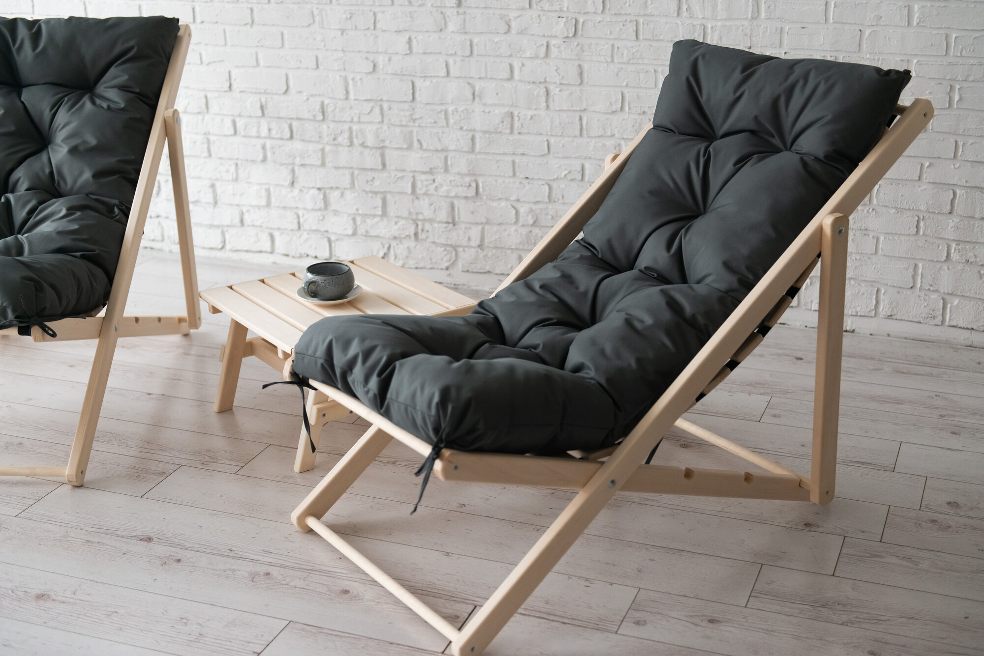 Комплект из двух кресел-шезлонгов с серыми матрасами и чайным столиком