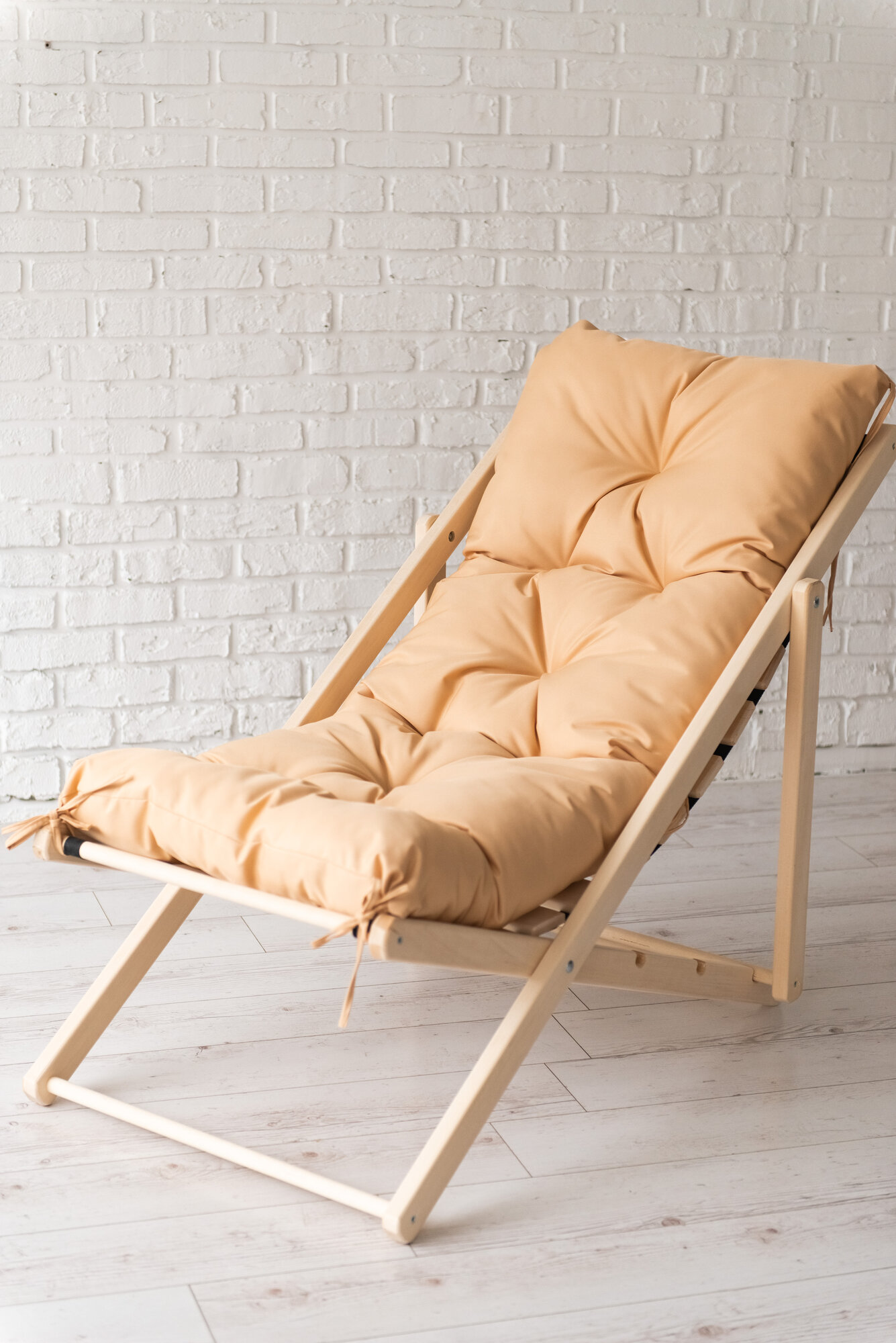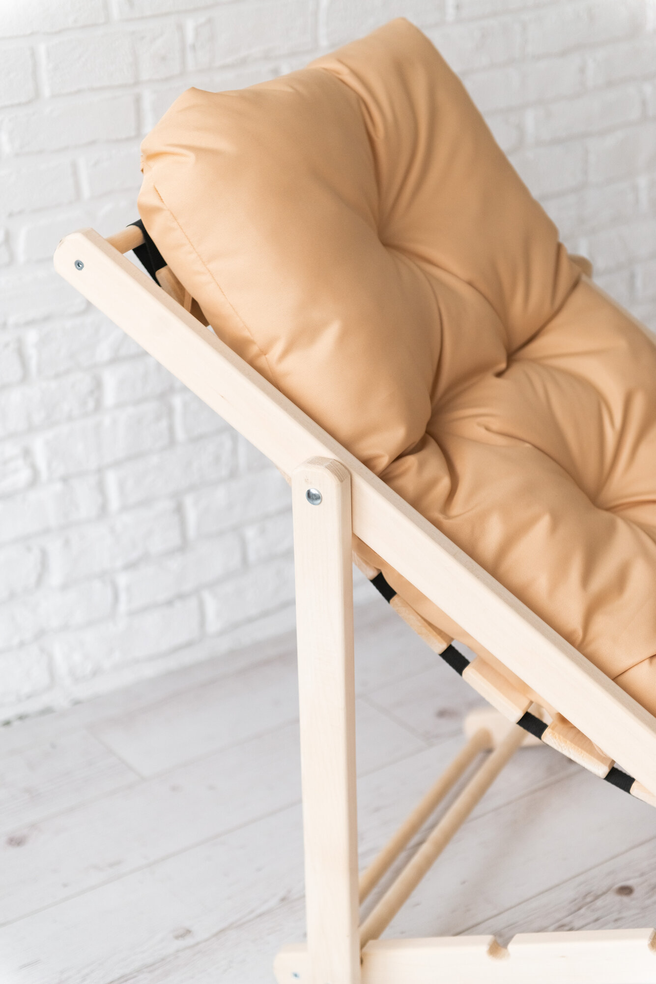 Комплект из двух деревянных кресел шезлонгов с бежевыми матрасами и столиком
