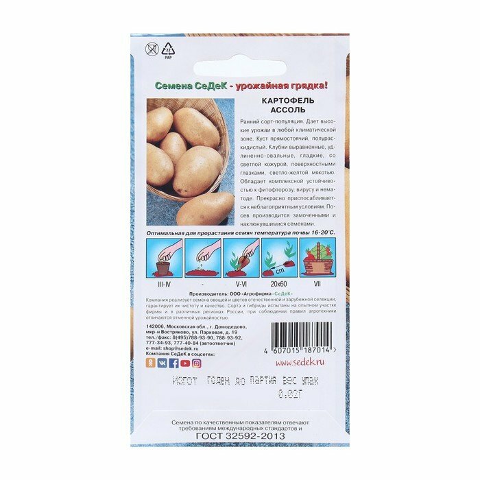 Ниже Вы можете прочитать отзывы на СеДеК Семена Картофель "Ассоль "0.02 г, ознакомится с подробными характеристиками, посмотреть интересные обзоры и фотографии на СеДеК Семена Картофель "Ассоль "0.02 г.