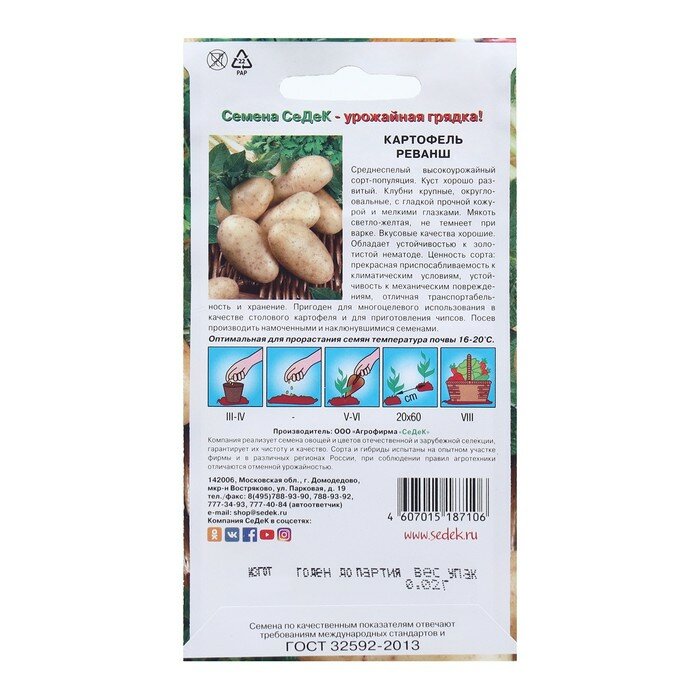 Ниже Вы можете прочитать отзывы на Семена Картофель Реванш 0,02г (Седек), ознакомится с подробными характеристиками, посмотреть интересные обзоры и фотографии на Семена Картофель Реванш 0,02г (Седек).