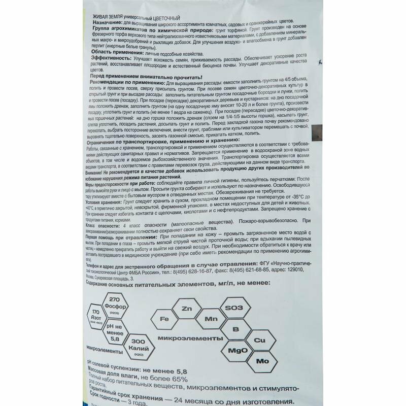 | Основные питательные вещества в мг/л, не менее | 150мг/л - азот NH4+NO3; 300мг/л - калий К20; 270мг/л - фосфор Р2О5; солевой суспензии 6,0-6,5рН |
