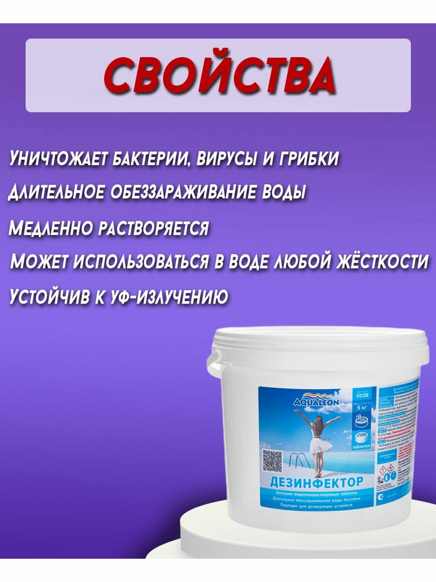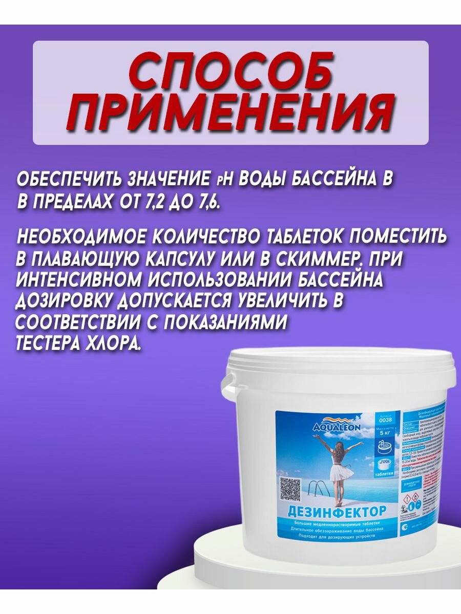 Дезинфектор медленный хлор Aqualeon в таблетках по 200 гр, 5 кг