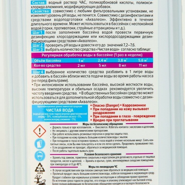 Дезинфицирующее комплексное средство Чистая Вода 4 в 1 Aqualeon 1 л .