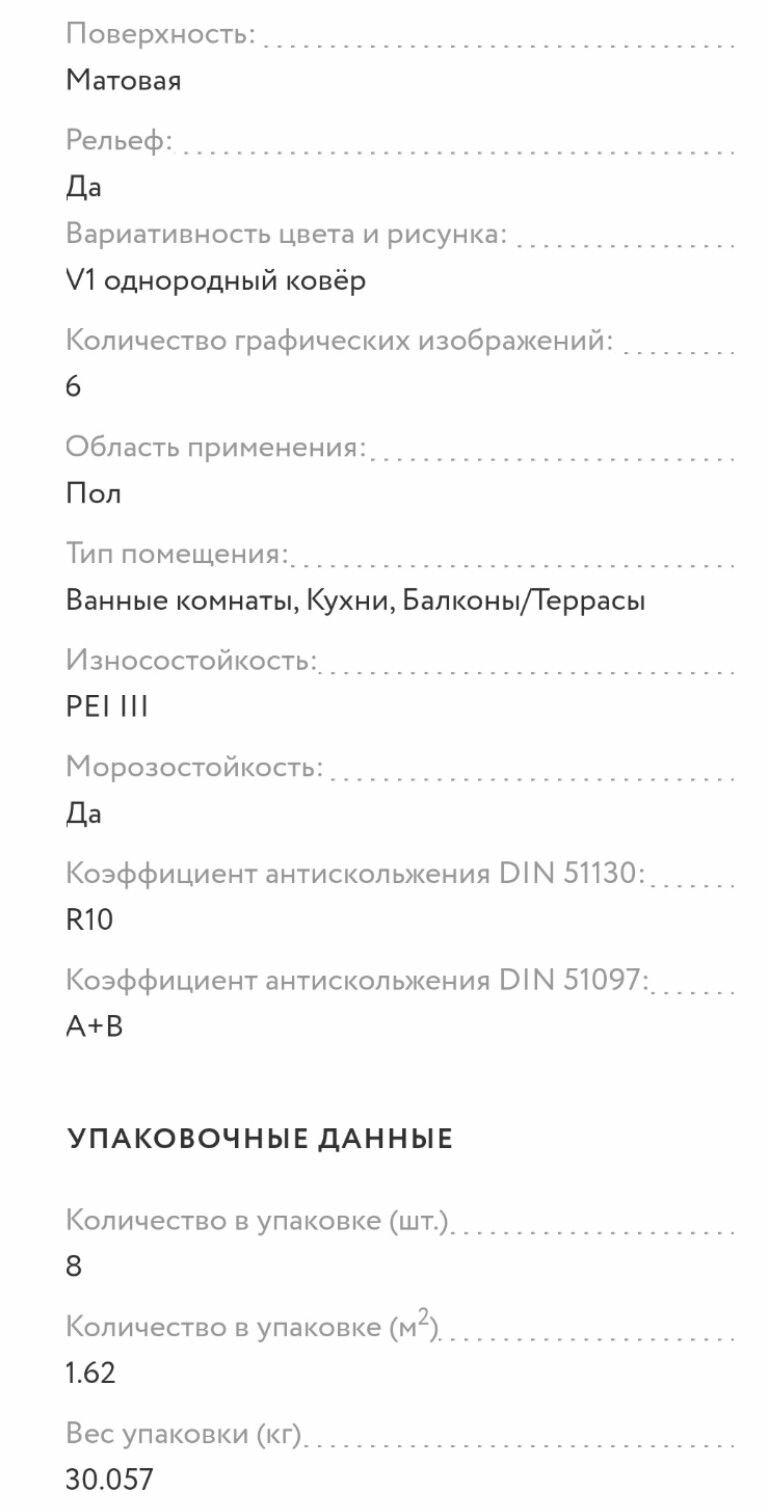 | Дополнительная информация | керамическая плитка и керамогранит отпускается только кратно упаковкам; декоративные элементы отпускаются поштучно; керамогранит имеет несколько вариантов графического изображения, которые упакованы в коробки случайным образом |