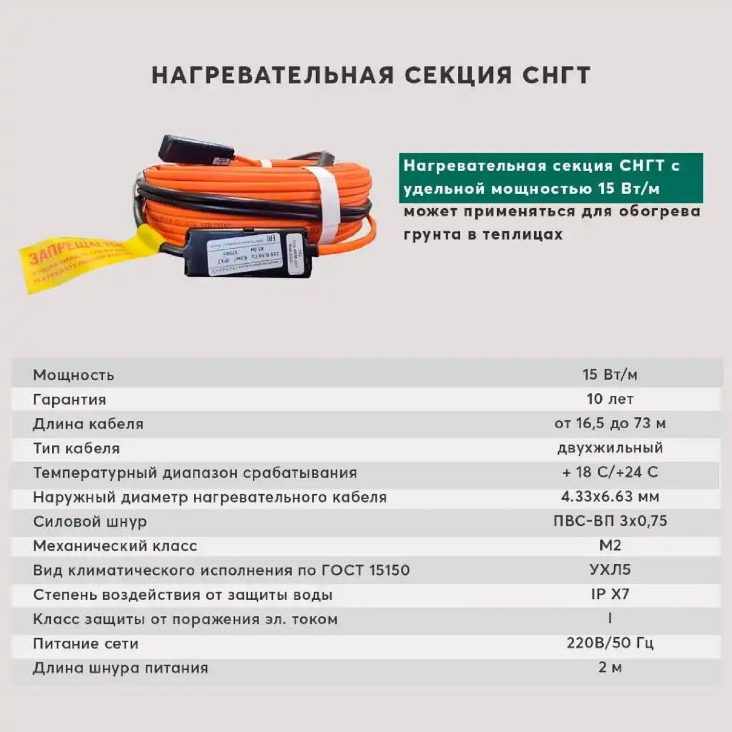 Греющий кабель ЧТК. Система обогрева грунта теплиц с термостатом снгт 8 кв. м. 855 Вт. 57 м.