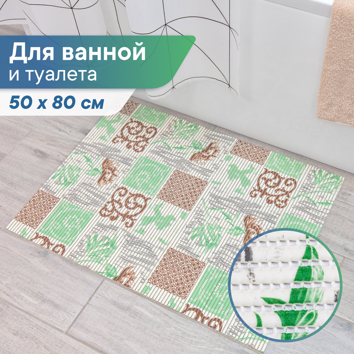 Коврик для ванны душа и туалета VILINA из вспененного ПВХ противоскользящий мягкий безворсовый 50х80см рисунком 100С