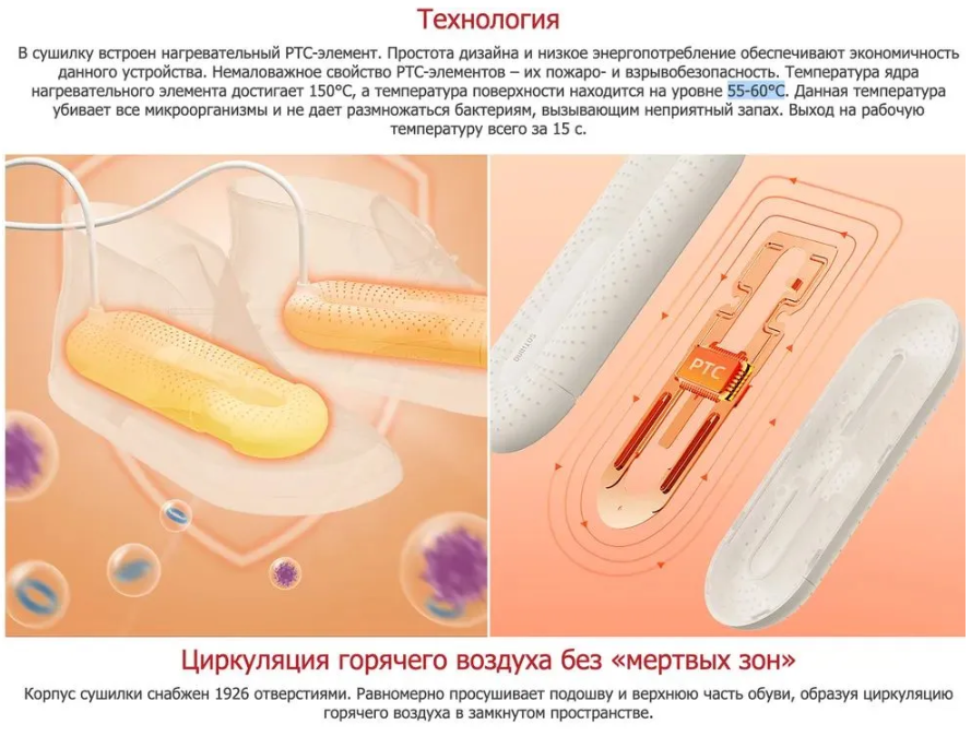 | Дополнительная информация | распространение тепла на 360°; сушка обуви при постоянной температуре; безопасный нагревательный элемент; керамические нагреватели достигают температуры до 150 градусов, при этом на поверхности поддерживаются постоянные 55 градусов; для лучшего распределения тепла поверхность вкладышей перфорирована; таймер на 3, 6 или 9 часов; долговечный огнестойкий пластик ABS UL94 VO; номинальная частота: 250-50 Гц;вилка версии CN; для подключения устройства к сети требуется переходник |