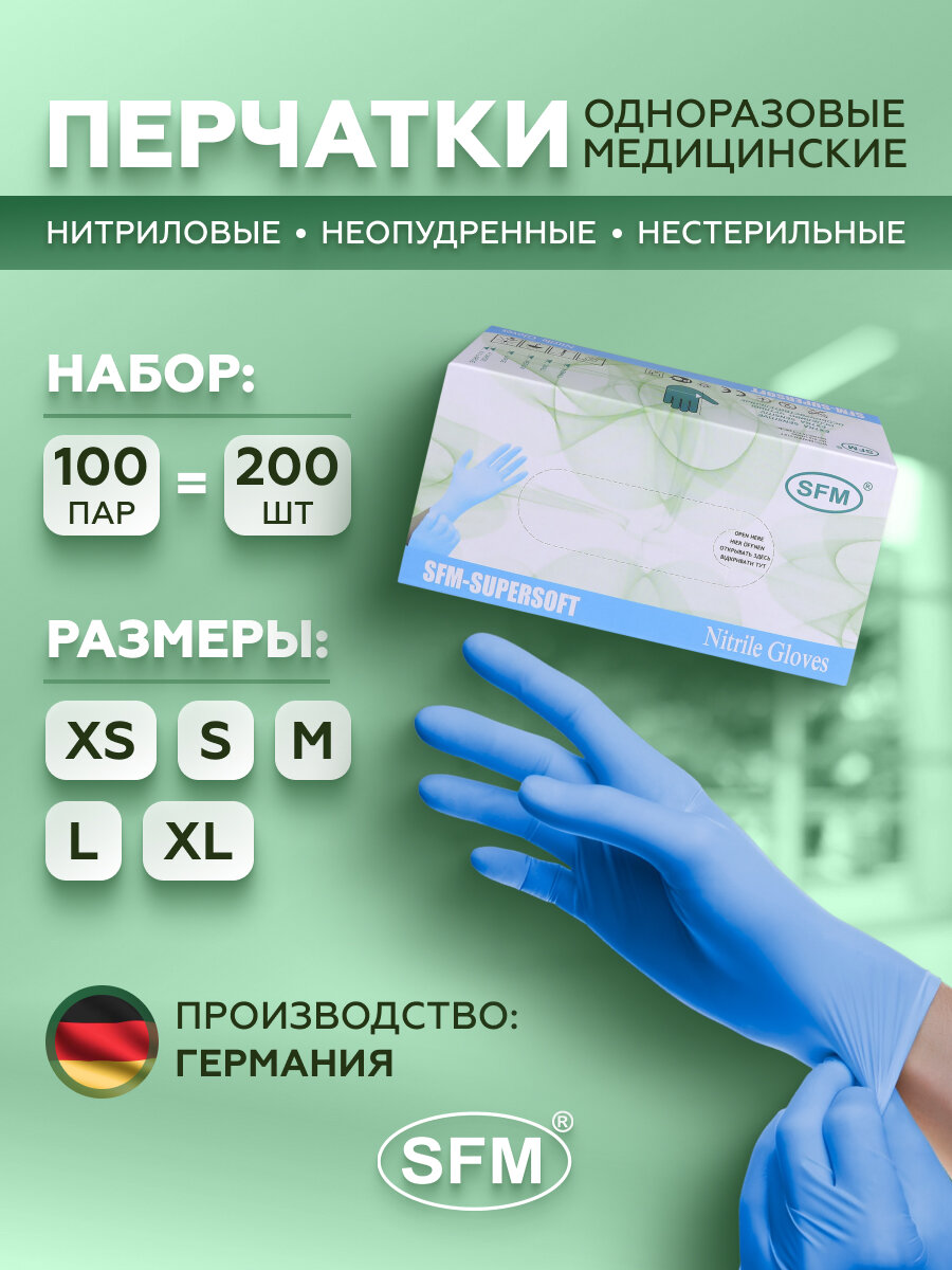 Перчатки нитриловые 24 см SFM-Supersoft Nitrile, цвет: голубой, размер M, 200 шт. (100 пар), неопудренные, текстурированные