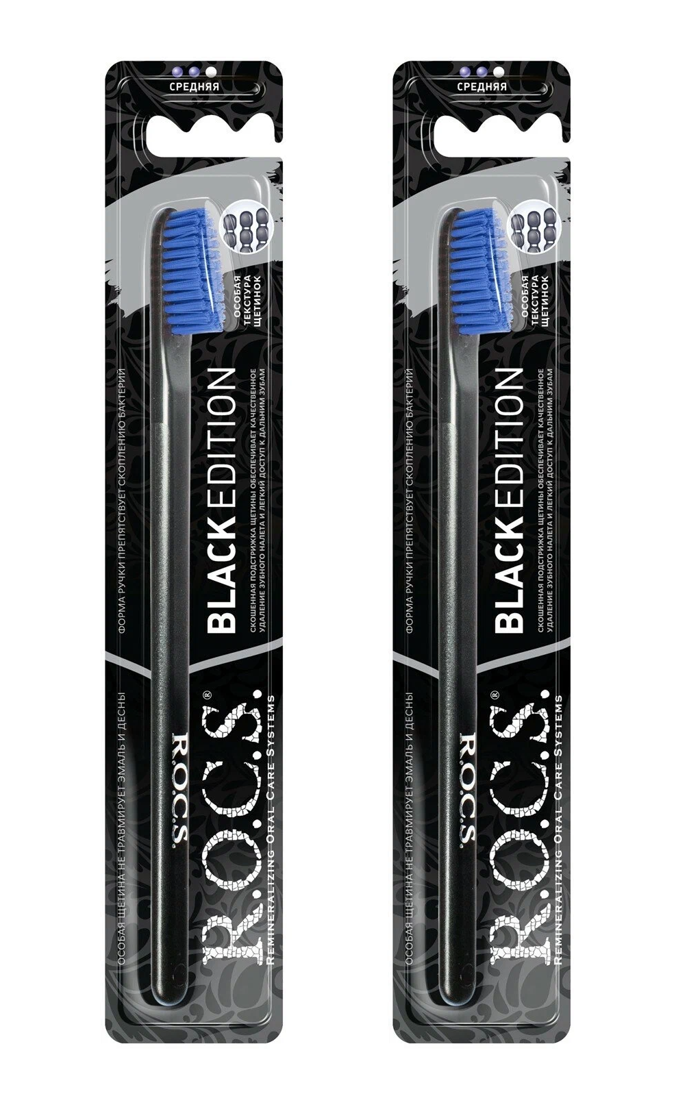 Зубная щетка R.O.C.S. Black Edition Classic, средняя жесткость, черная/синяя, 2 щетки