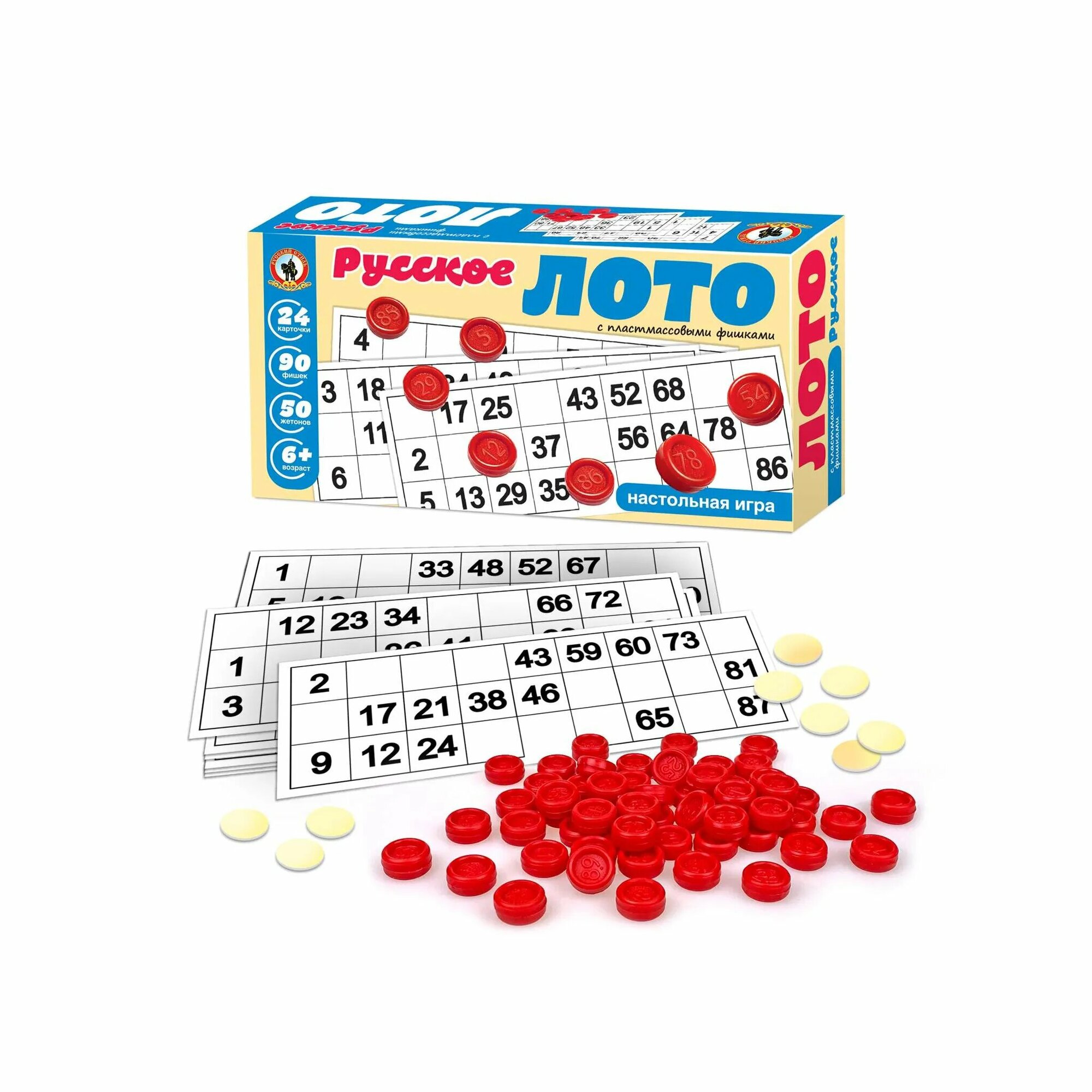 | Подробная комплектация | карточки – 24 шт, фишки с номерами – 90 шт, жетоны – 50 шт, правила |