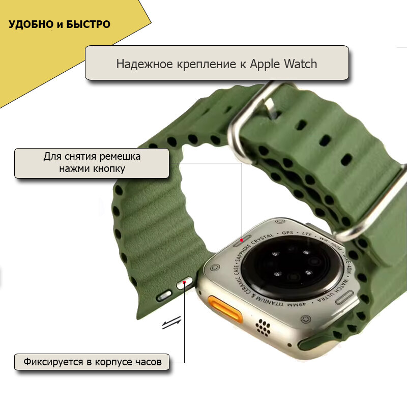 Ниже Вы можете прочитать отзывы на Ремешок для Apple Watch Series 1-10, SE, Ultra 42/44/45/49mm, Ocean Band, Хаки, ознакомится с подробными характеристиками, посмотреть интересные обзоры и фотографии на Ремешок для Apple Watch Series 1-10, SE, Ultra 42/44/45/49mm, Ocean Band, Хаки.