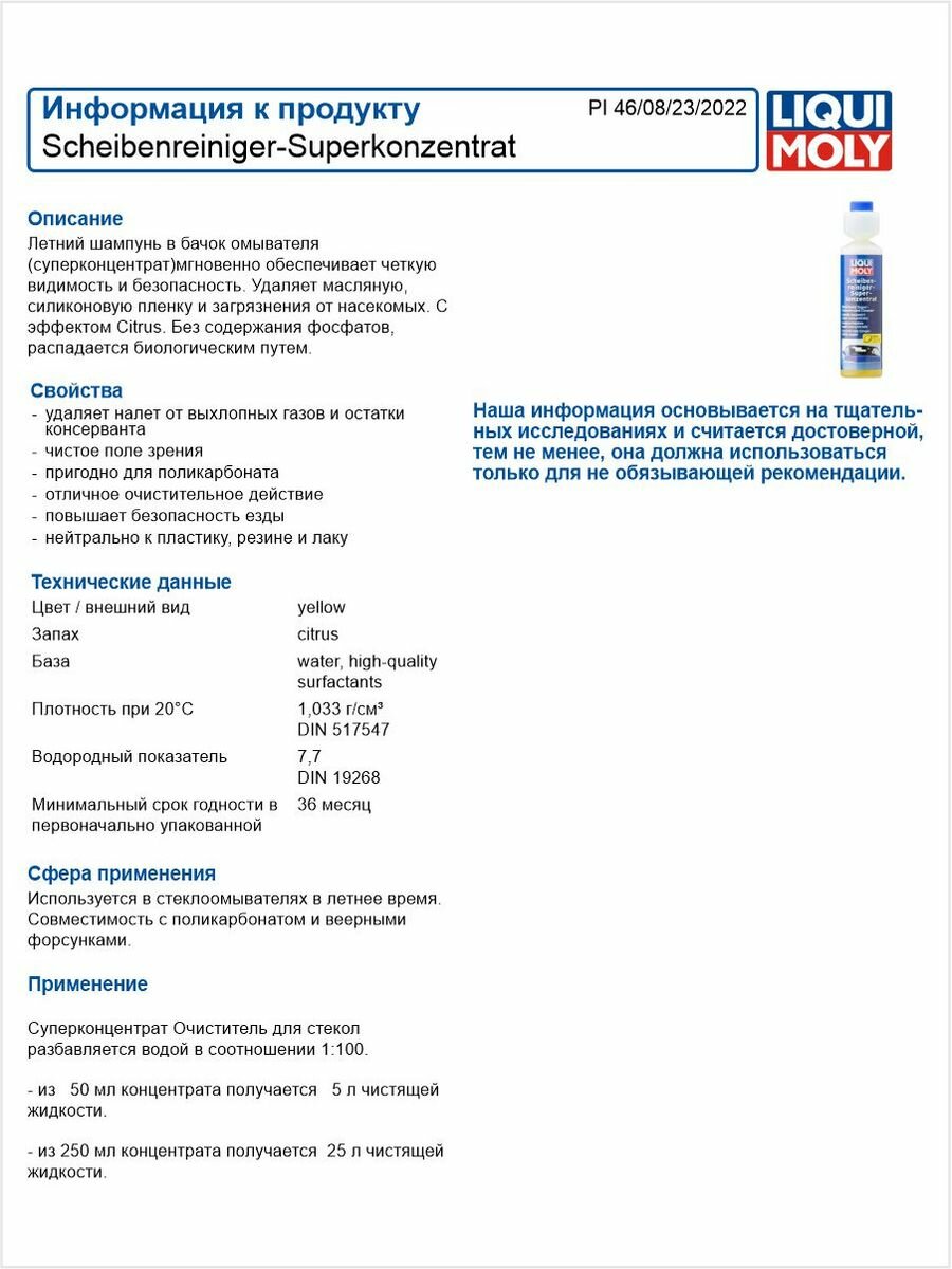 LIQUI MOLY Шампунь летн в бачок омыват LIQUI MOLY 0,05л Scheiben-Reiniger Super Konzentrat интересное: