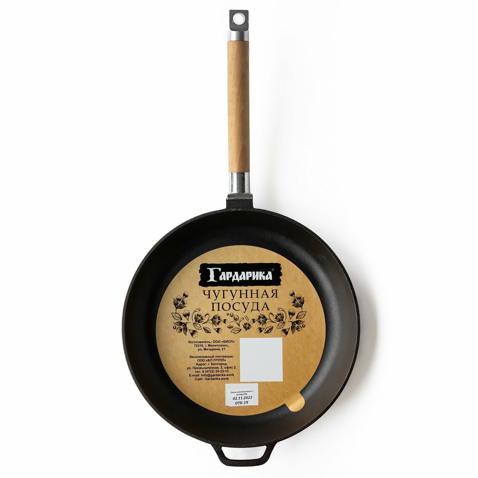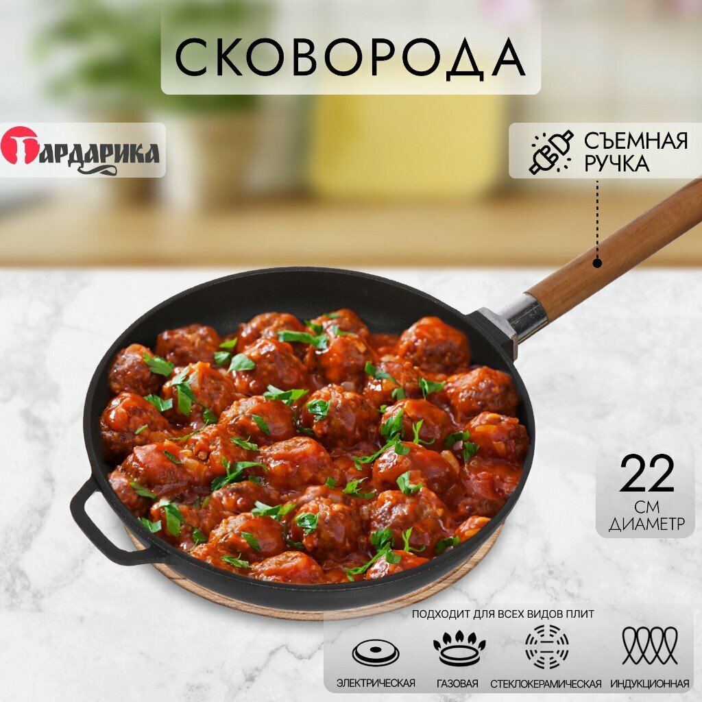 Сковорода чугун, 22 см, Гардарика, 0122, съемная ручка, с деревянной ручкой, индукция