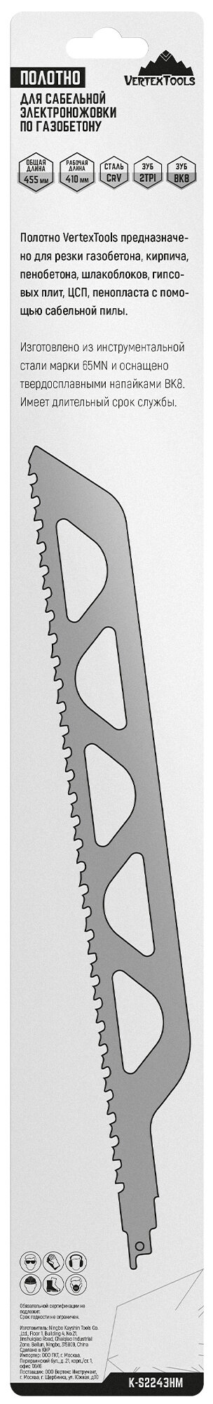 | Дополнительная информация | Полотно для сабельной пилы по газобетону Vertextools K-S2243HM 455 мм |