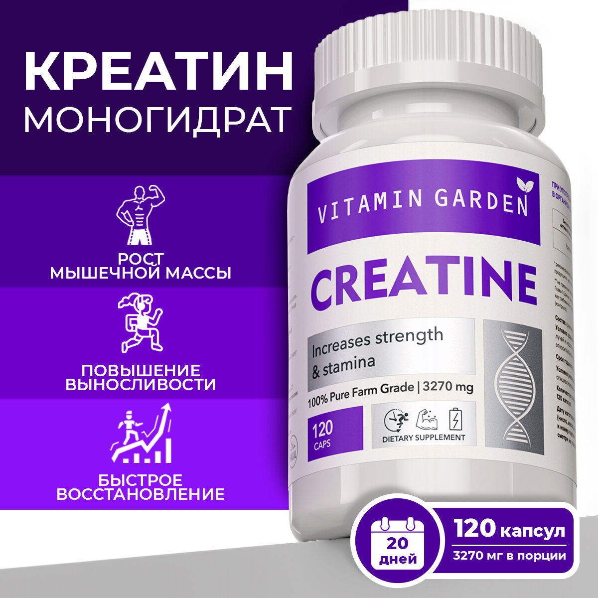 Креатин, Creatine, аминокислота, Спортивное питание для набора массы и роста мышц, для тренировок и спорта. 120 капсул