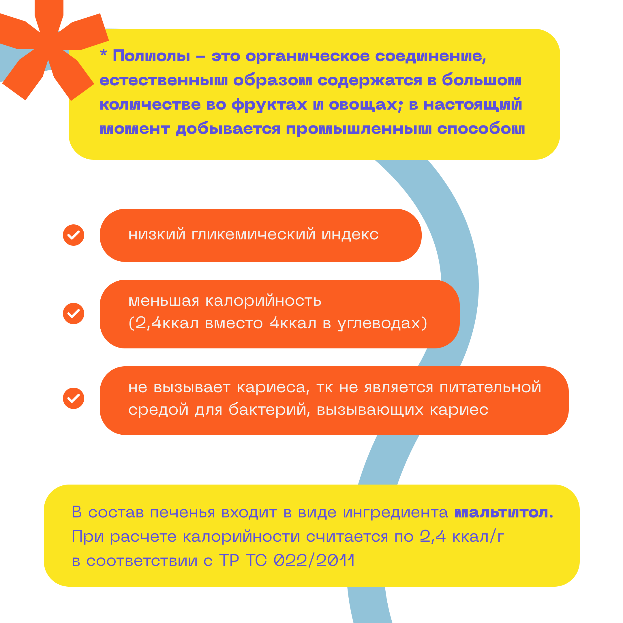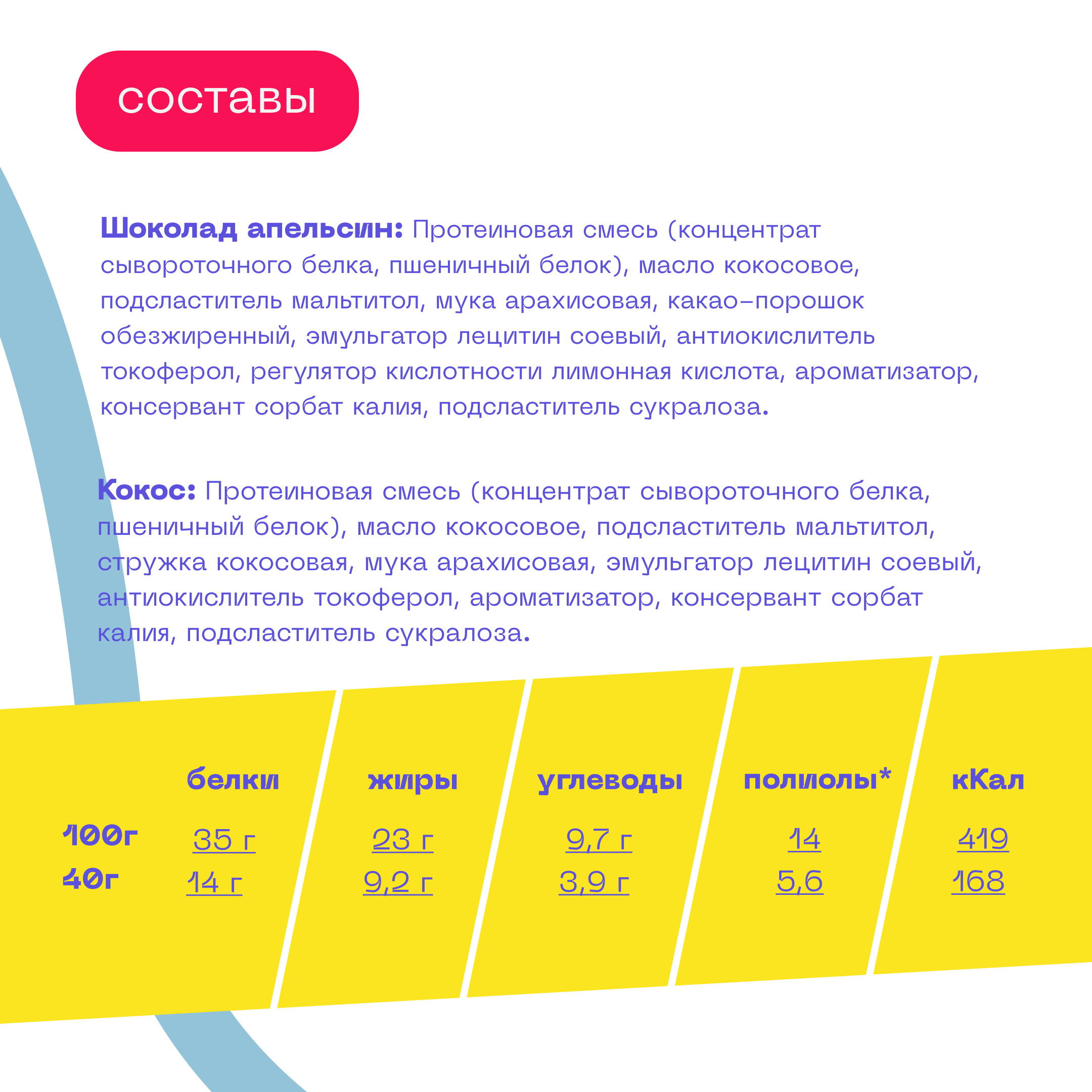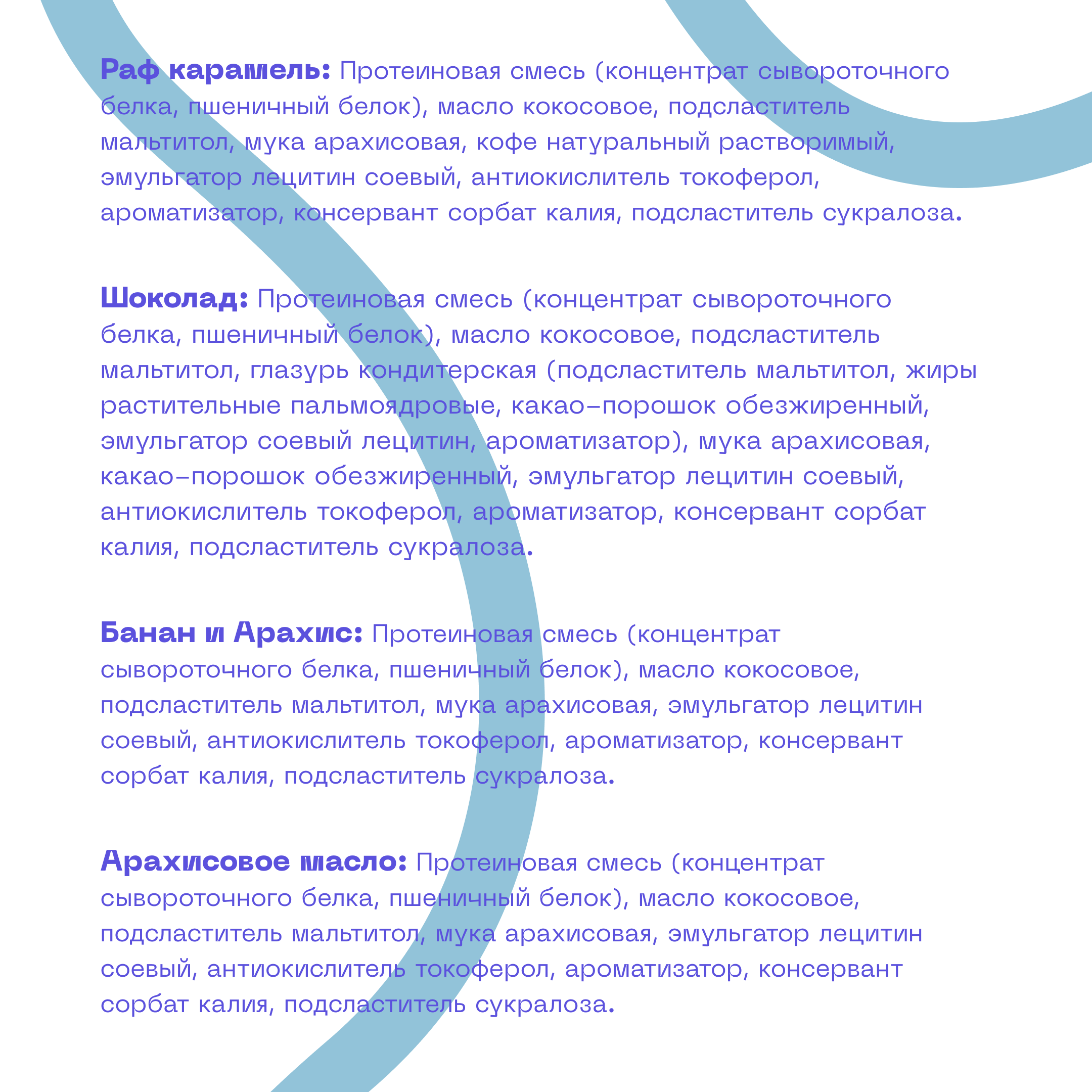 | Дополнительная информация | "Состав: Протеиновая смесь (концентрат сывороточного белка, пшеничный белок), масло кокосовое, подсластитель мальтитол, мука арахисовая, эмульгатор лецитин соевый, антиокислитель токоферол, ароматизатор, консервант сорбат калия, подсластитель сукралоза.Пищевая и энергетическая ценность на 100г: Белки 35г, жиры 23г, углеводы 9,7г, полиолы 14г, 419 ккал/1754 кДж/ на порцию: Белки 14г, жиры 9,2г, углеводы 3,9г, полиолы 5,6г, 168 ккал/703 кДж. Способ применения: Это печенье отлично разнообразит ваш рацион. 2 штуки в день заменят один прием пищи и обеспечат до 30% дневной потребности в белке* (*в зависимости от индивидуальных параметров)" |