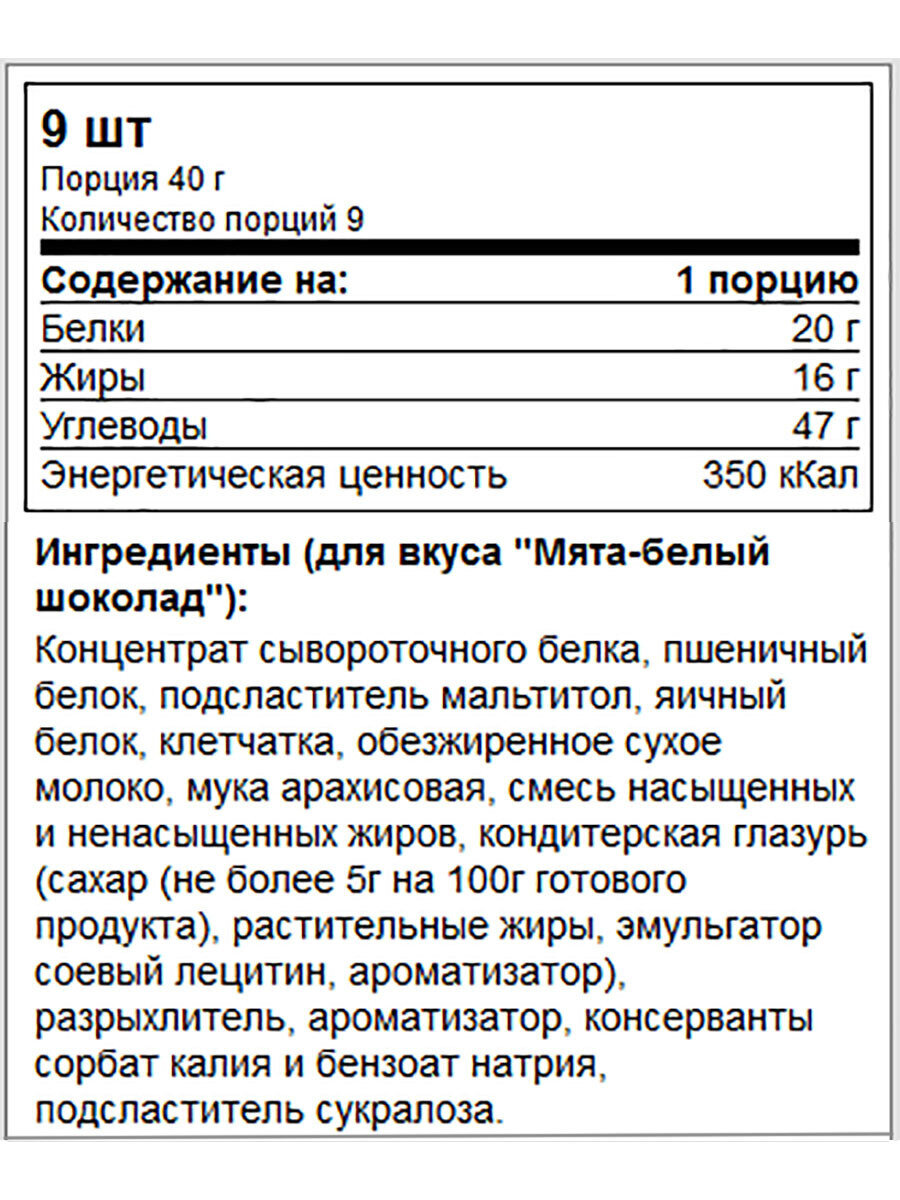 | Дополнительная информация | кокосовая мука, арахисовая мука, миндальная мука, обезжиренный какао порошок, орехи, желейно-мармеладные кусочки, кондитерская глазурь включаются в состав в зависимости от вкуса; при чрезмерном употреблении может оказывать слабительное действие; форма выпуска: печенье; состав: концентрат сывороточного белка, пшеничный белок, подсластитель мальтитол, яичный белок, клетчатка, смесь насыщенных и ненасыщенных жиров, разрыхлитель, ароматизатор, консерванты сорбат калия и бензоат натрия, подсластитель сукралоза |