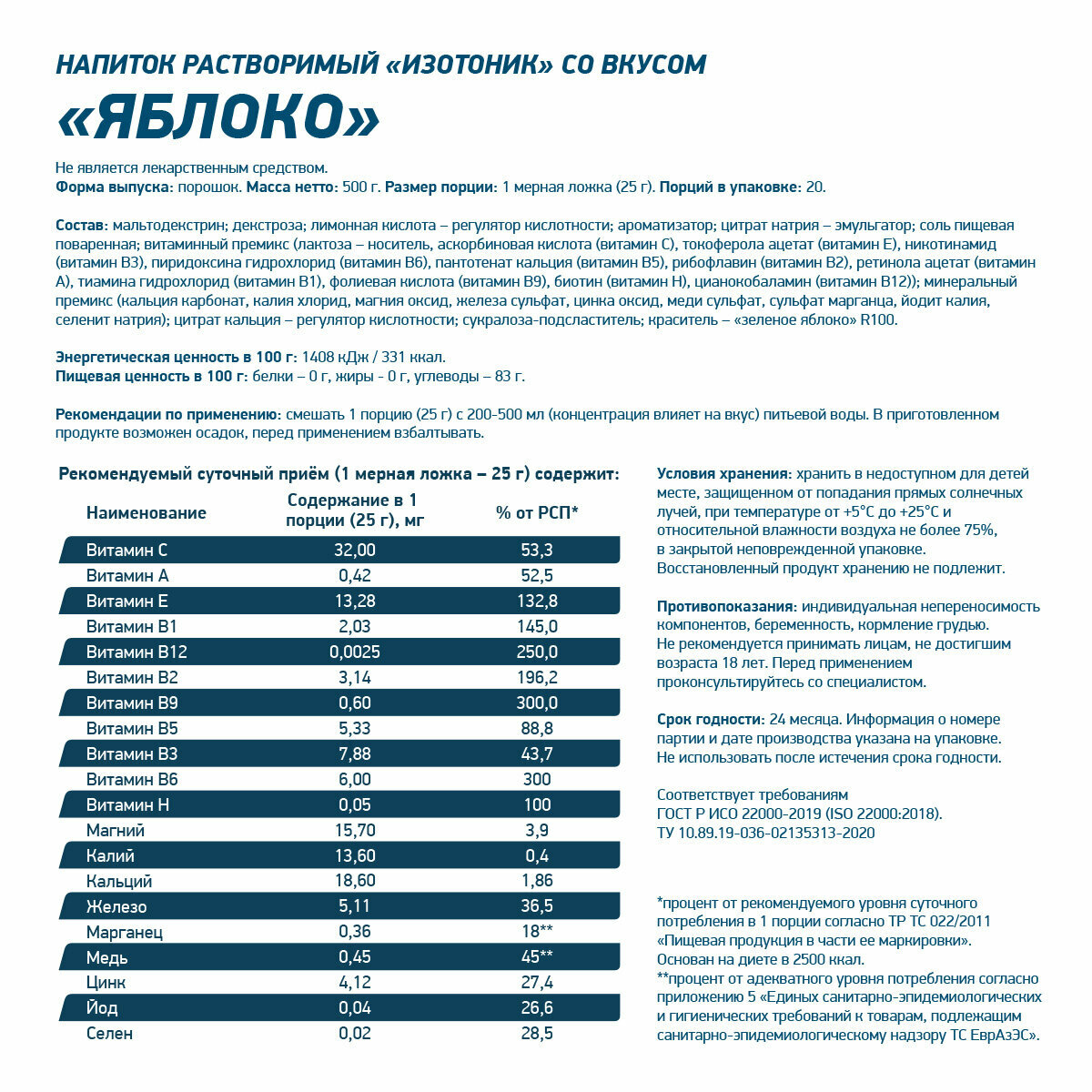 | Состав | мальтодекстрин, сахароза, декстроза, нутриоза, регуляторы кислотности: лимонная кислота, цитрат натрия, цитрат кальция; ароматизатор, хлорид натрия, бензоат натрия (консервант), витаминный премикс 10-14 (лактоза, аскорбиновая кислота (витамин С), токоферола ацетат (витамин Е), никотинамид (витамин В3), пиридоксина гидрохлорид (витамин В6), пантотенат кальция (витамин В5), рибофлавин (витамин В2), ретинола ацетат (витамин А), тиамина гидрохлорид (витамин В1), фолиевая кислота (витамин В9), биотин (витамин Н), цианокобаламин (витамин В12), минеральный премикс 4-14 (кальция карбонат, калия хлорид, магния оксид, железа сульфат, цинка оксид, меди сульфат, сульфат марганца, йодит калия, селенит натрия), сукралоза (подсластитель), краситель: зеленое яблоко R100 |